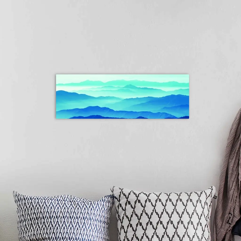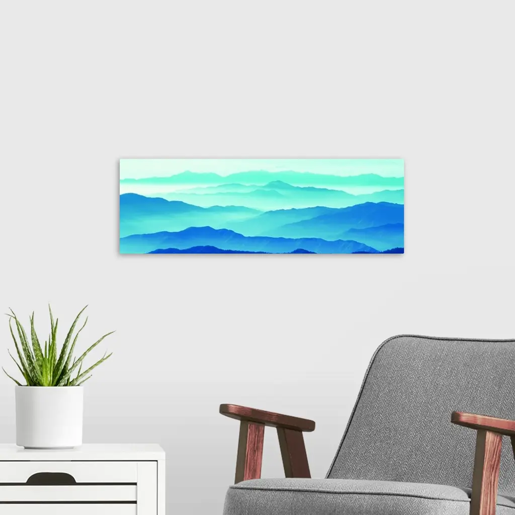 Giant monochromatic photograph shows a considerable amount of mist rolling over the many layers of a mountain range.