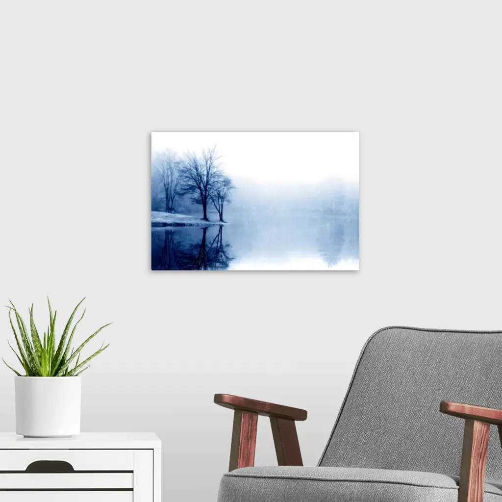 A photograph taken of a lake with bare trees off to the left side and more trees behind dense fog toward the back of the lake.