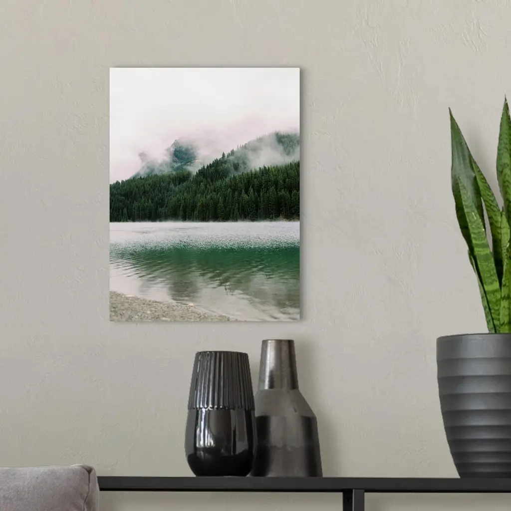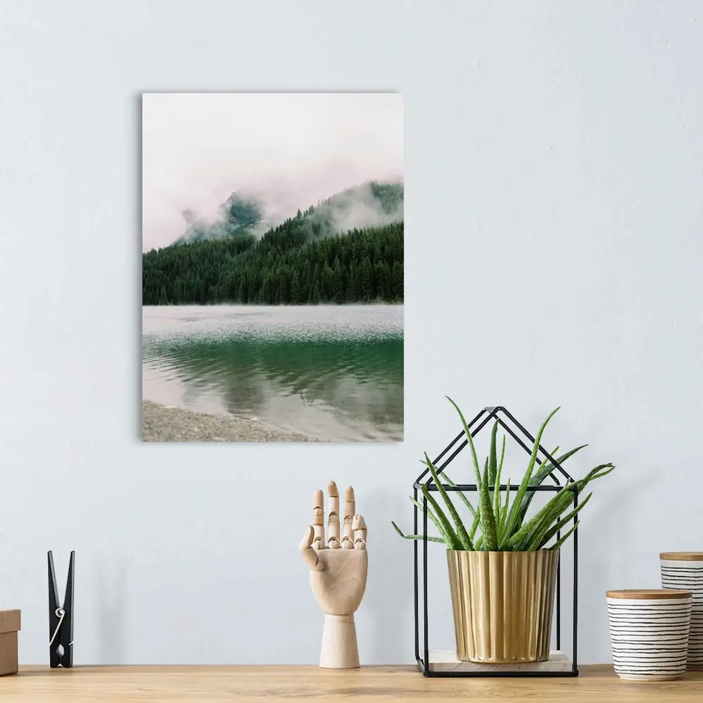 A photograph of dense evergreen trees by the side of a clear lake interspersed with low clouds and mist.