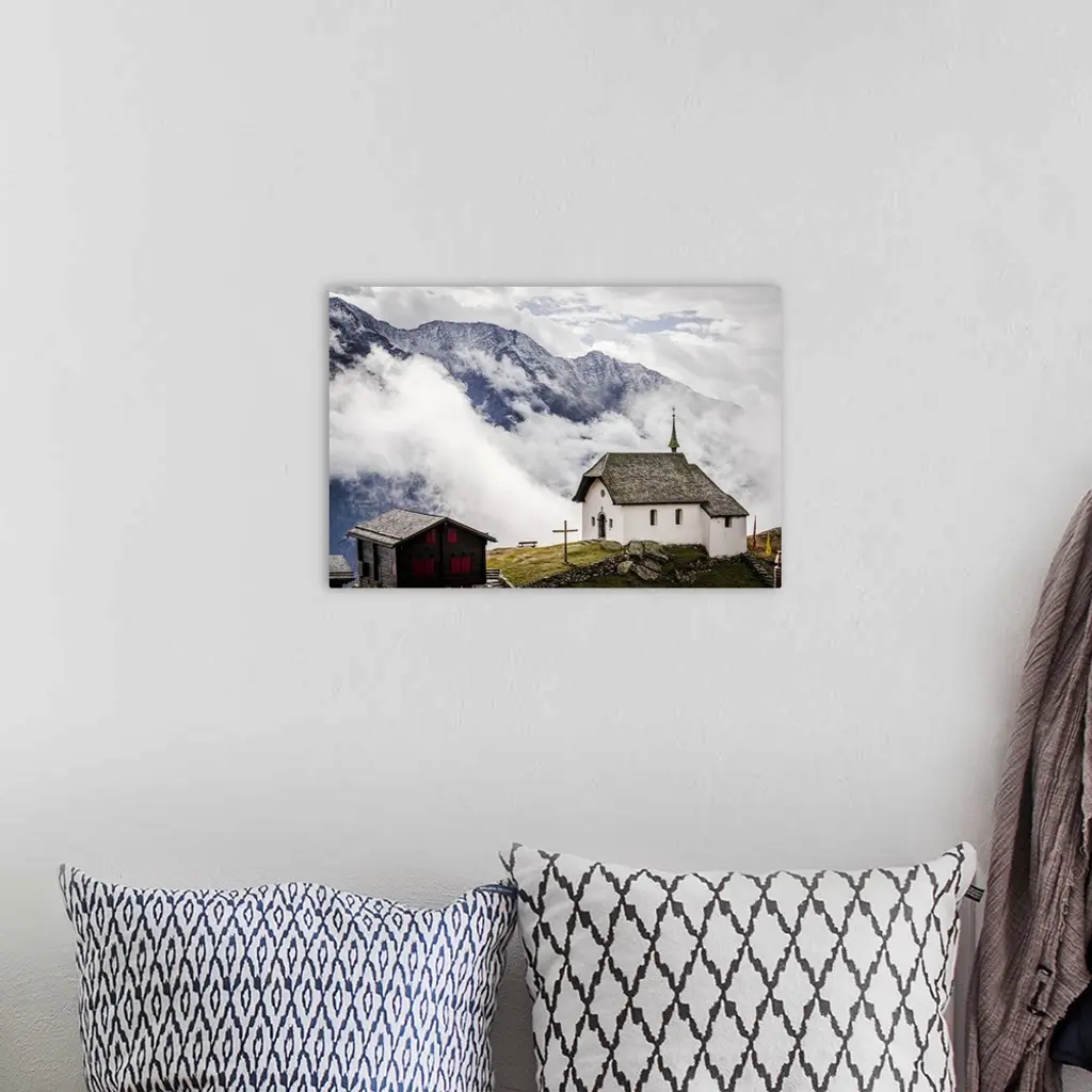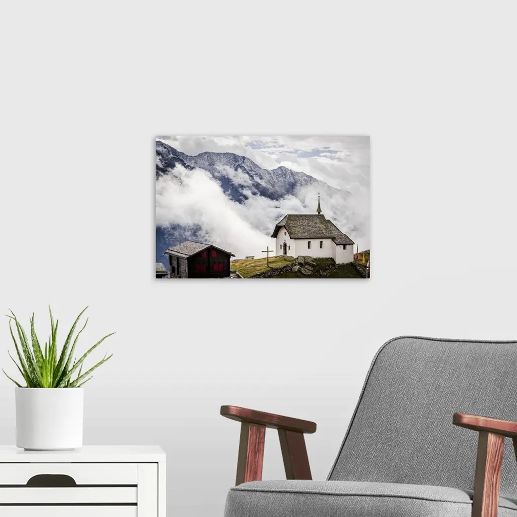 Foggy sky over the small church in the alpine village of Bettmeralp, canton of Valais, Switzerland, Europe