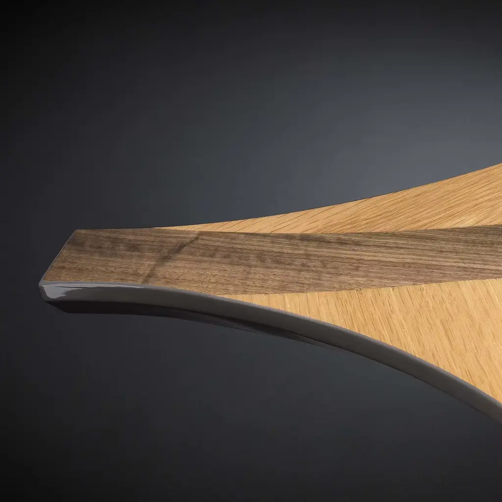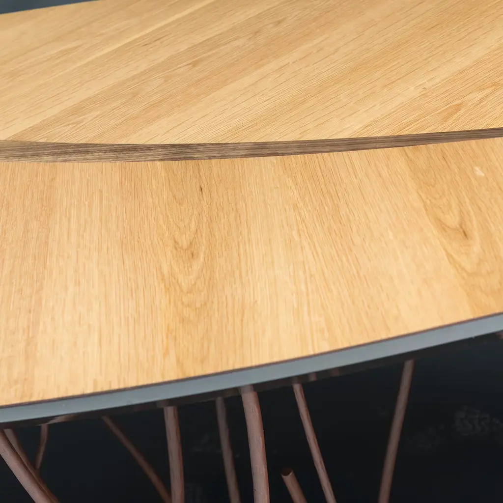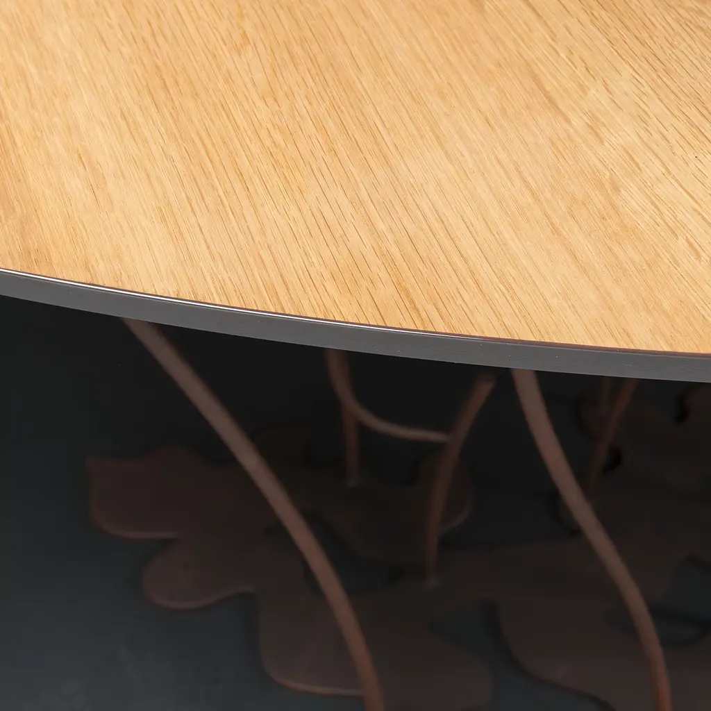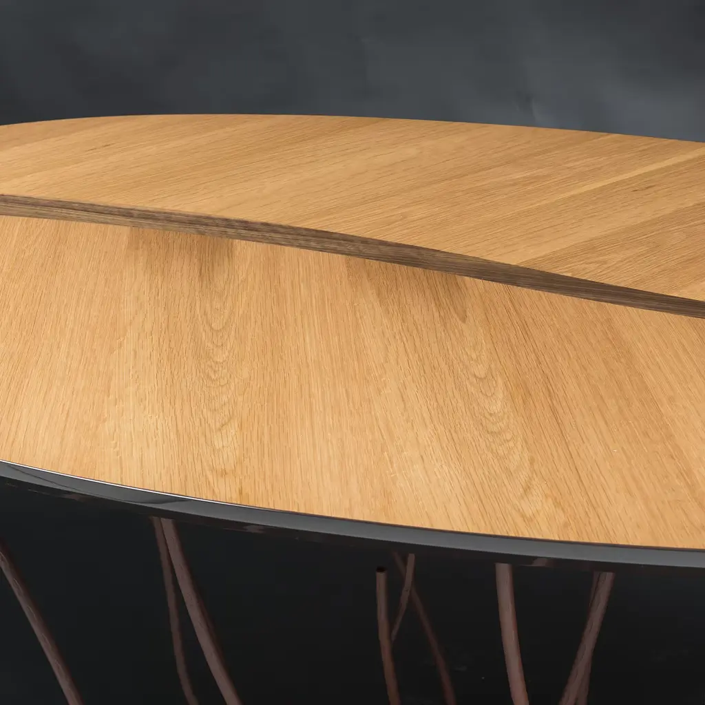 Expressing a home's bond with nature lies in the singular, romantic design of this phytomorphic console inspired by the ancient "La Fenice" theatre in Venice. The leaf-shaped top in Canaletto walnut and durmast seemingly floats over the graceful, cortex-finished metal base consisting of graceful stem-like elements sitting on an intensely sinuous plate.