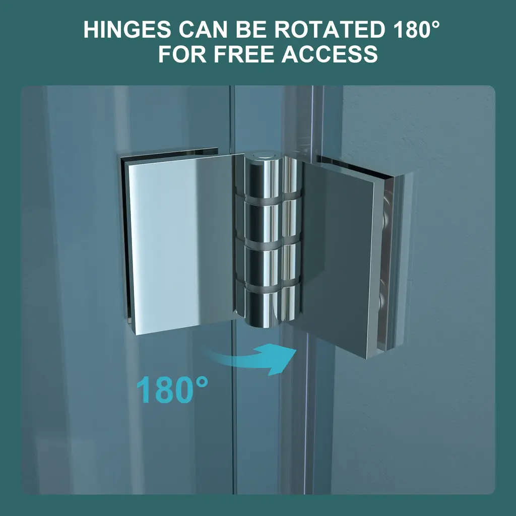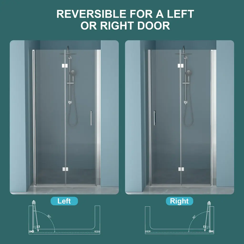 Product Features Bi-Fold Frameless Shower Door: This shower door is 30 in. W x 72 in. H; Premium 1/4 inch (6 mm) thick tempered clear glass. Water-resistant Screen Defends Against Limescale, Ensuring Long-Lasting Cleanliness. Premium-Grade Components: The aluminum frame and sturdy hinges of our shower doors are crafted from high-grade stainless steel. Flexible installation: Designed for flexible installation, our frameless glass shower door offers reversible options for both right- and left-hand door opening, tailored to your specific layout. The hinges and shaft feature a 180° overlapping rotate angle for efficient space-saving. Adjustable: This shower door offers a 1 3/8-inch adjustability range, ensuring it can be tailored to fit various wall spacing widths in shower rooms. (Including trapezoidal walls) Saving space: Wide entry, minimal space. Maximizes bathroom functionality with sleek, unobtrusive design. Ideal for small spaces.