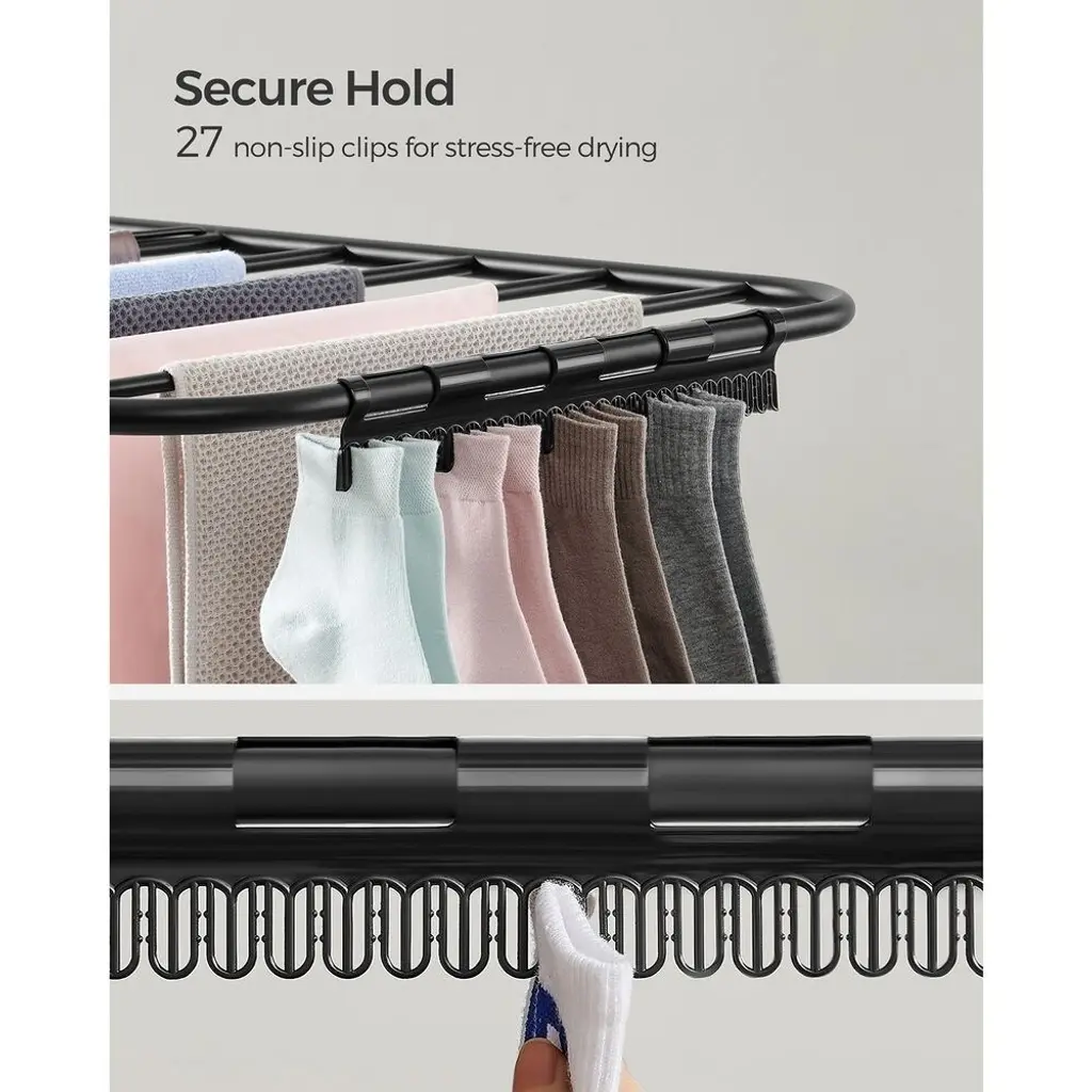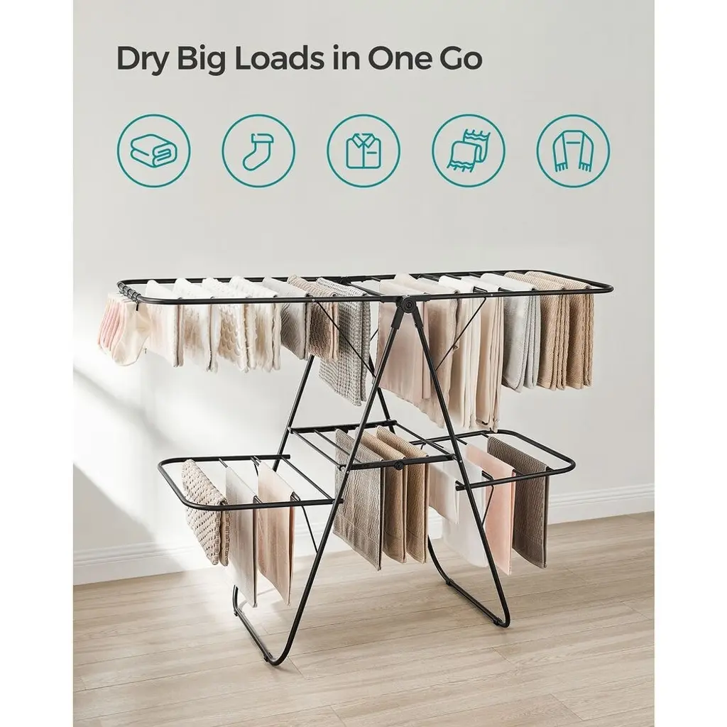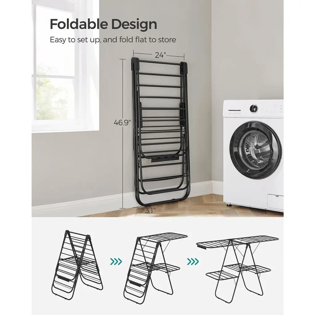 Foldable 2-Level Free-Standing Steel Tubes Laundry Stand With Height-Adjustable Wings - 61.8" X 22" X 44.9" - Black