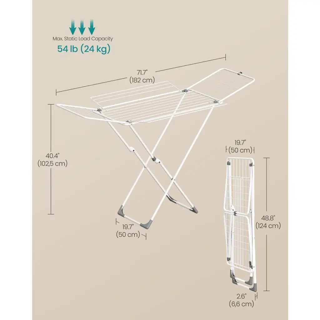 Revolutionize your laundry routine with this premium 4-wing drying rack offering 70 feet of drying space across 23 rods - perfect for everything from delicates to bulky bedding. The innovative foldable design collapses to just 2.6" deep for ultra-compact storage, while thoughtful features like sliding loops and secure clips ensure hassle-free operation. Built with rust-resistant metal and floor-protecting feet, it's equally effective indoors or outdoors. The energy-efficient air-drying process gently preserves fabrics while reducing your carbon footprint. With a generous 31.7" x 71.7" footprint when open, this drying rack combines massive capacity with space-saving convenience. Material: Steel, PP Plastic Product Size: 19.7"D x 71.7"W x 40.4"H (50 x 182 x 102.5 cm) Folded Size: 2.6"D x 19.7"W x 48.8"H (6.6 x 50 x 124 cm) Product Weight: 7.2 lb (3.3 kg) Max. Static Load Capacity: 54 lb (24 kg)