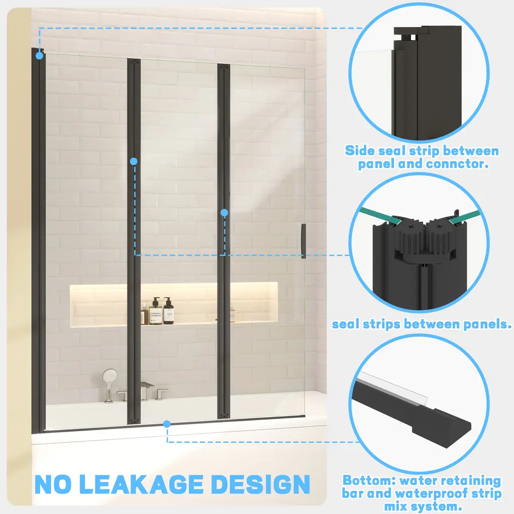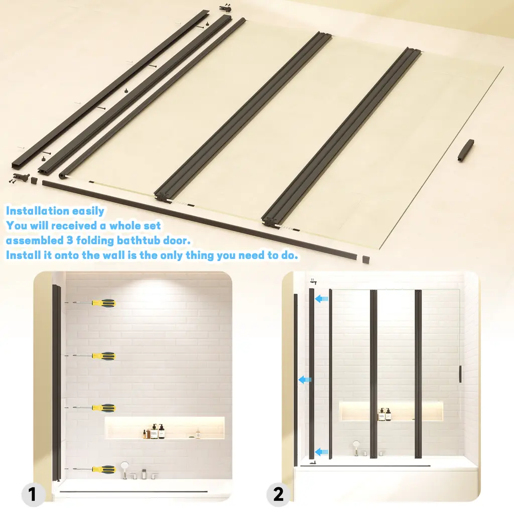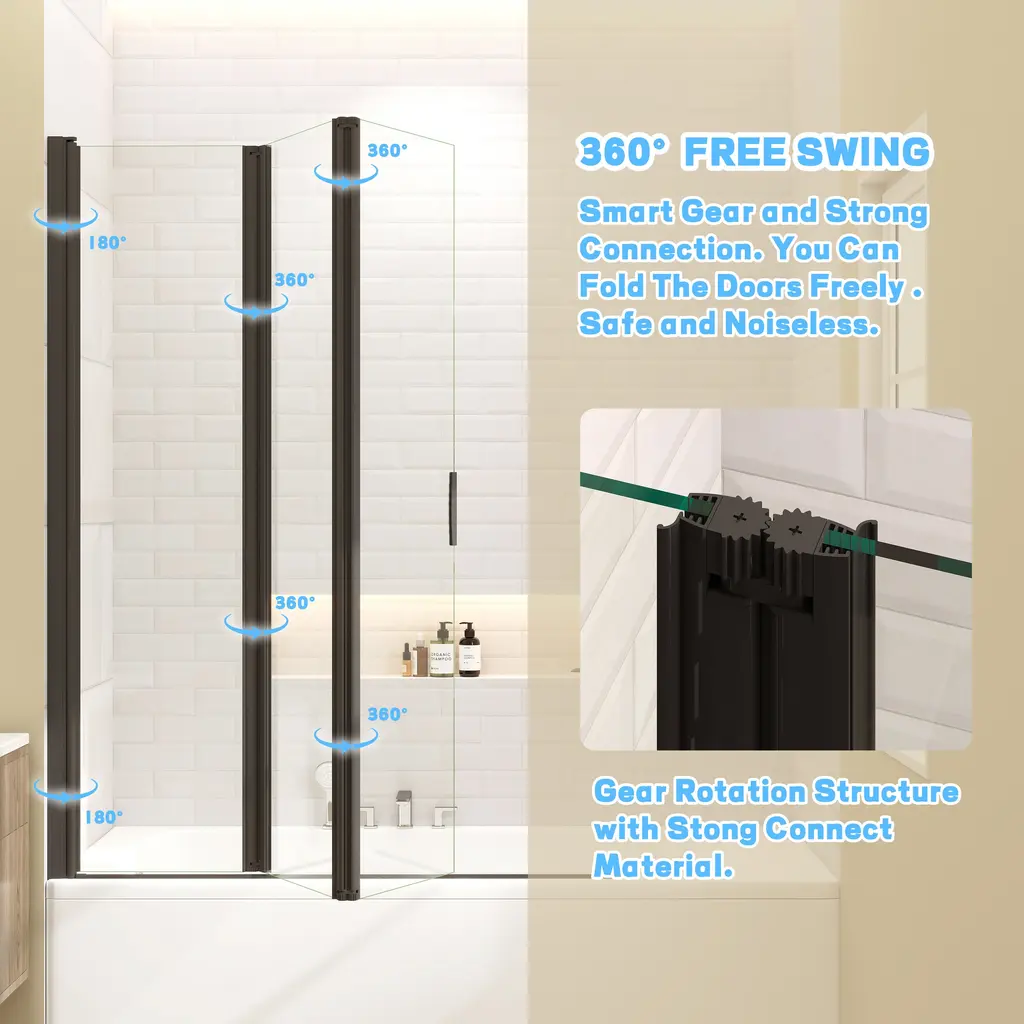 Foldable Function:The door against the wall can rotate 180 degrees, Two glass doors can rotate 360 degrees between them . Performance tailored to local conditions:The product Adopting reversible design,can be installed according to the customer's bathroom space, saving space High waterproof performance:Adopting a leak free design, the waterproof strip between the two doors, the waterproof strip between the door and the side wall, and the bottom water blocking strip+waterproof strip. Using high-quality glass:The screen is made of tempered safety glass, which is very sturdy and safe. Double sided easy to clean:Our bathtub door is coated with a proprietary glass shielding coating. This coating is waterproof, soap resistant, and dirt resistant, making cleaning easy. Gift door clip:Comes with a free dedicated fixture that locks three plates when folded . Easy installation:You will received a whole set assembled 3 folding bathtub door