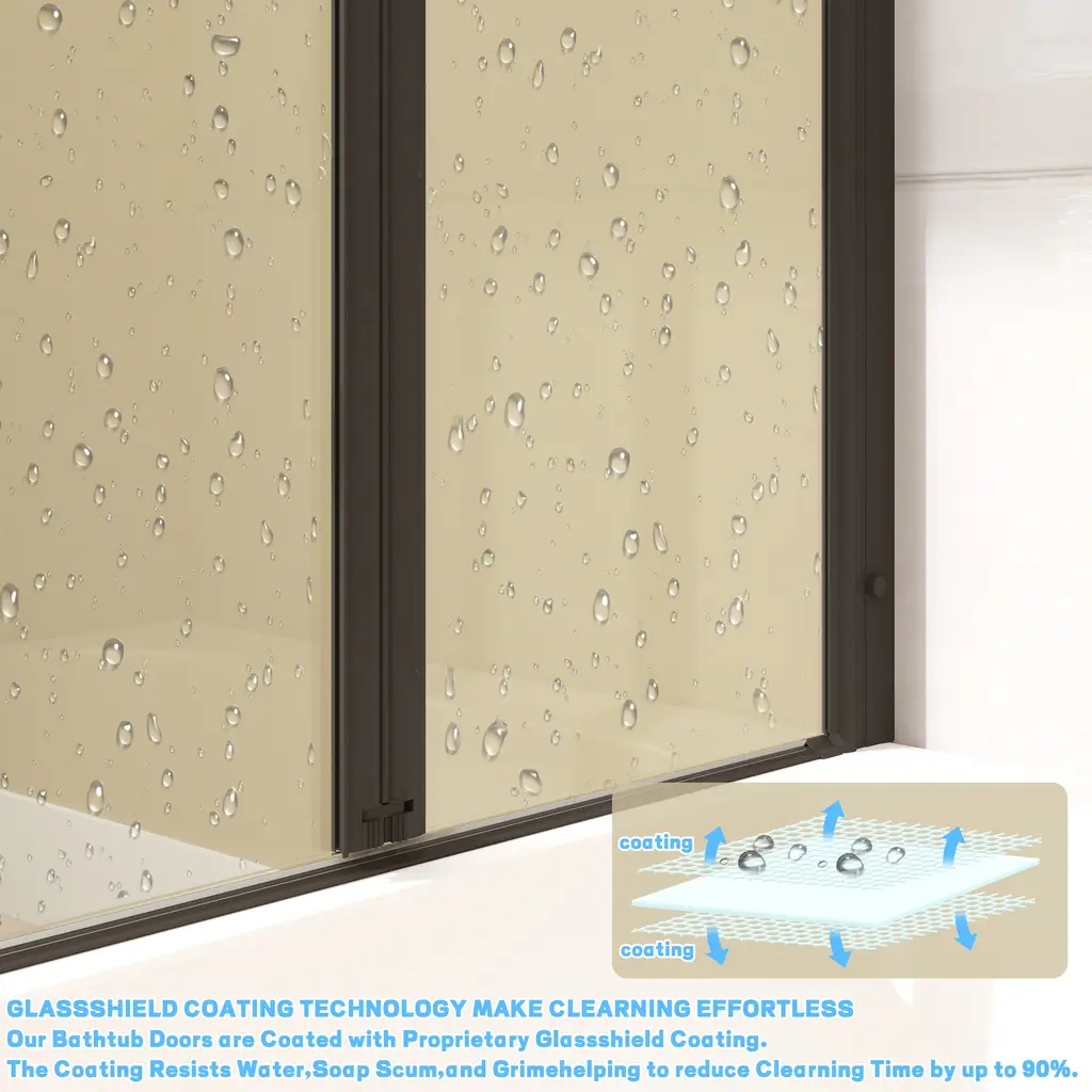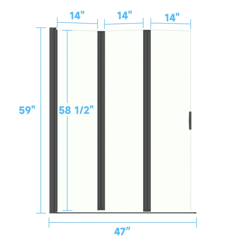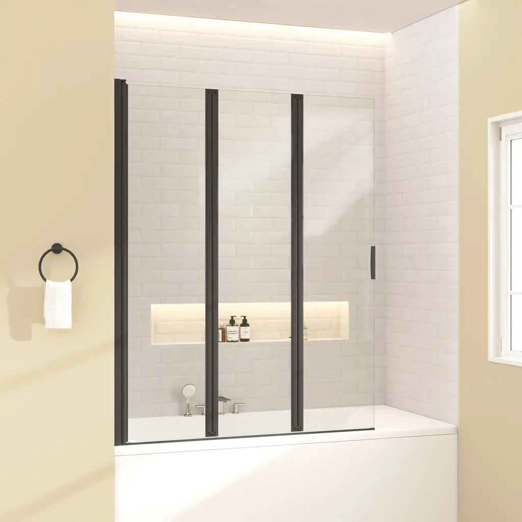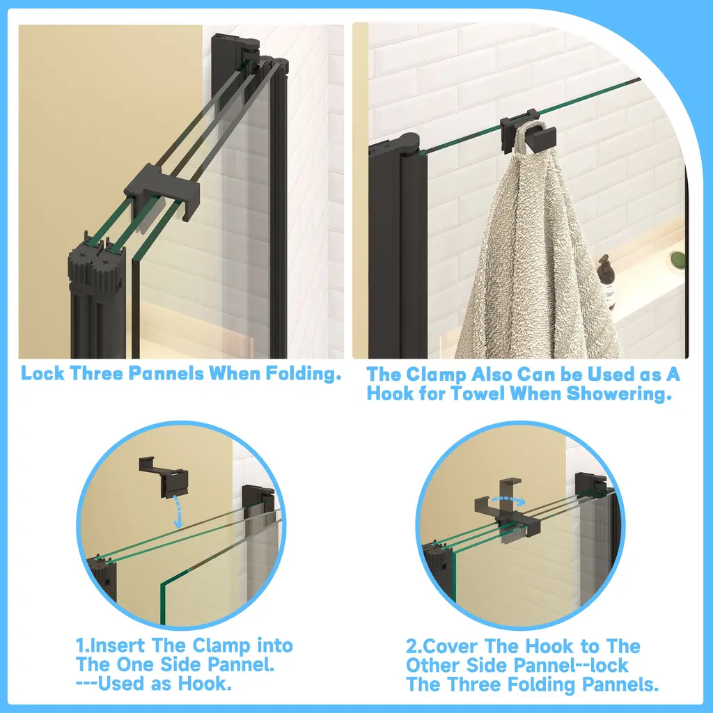 Foldable Function:The door against the wall can rotate 180 degrees, Two glass doors can rotate 360 degrees between them . Performance tailored to local conditions:The product Adopting reversible design,can be installed according to the customer's bathroom space, saving space High waterproof performance:Adopting a leak free design, the waterproof strip between the two doors, the waterproof strip between the door and the side wall, and the bottom water blocking strip+waterproof strip. Using high-quality glass:The screen is made of tempered safety glass, which is very sturdy and safe. Double sided easy to clean:Our bathtub door is coated with a proprietary glass shielding coating. This coating is waterproof, soap resistant, and dirt resistant, making cleaning easy. Gift door clip:Comes with a free dedicated fixture that locks three plates when folded . Easy installation:You will received a whole set assembled 3 folding bathtub door