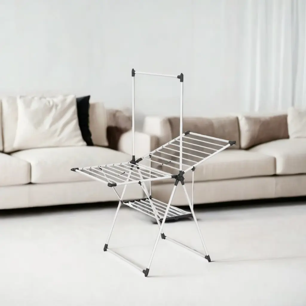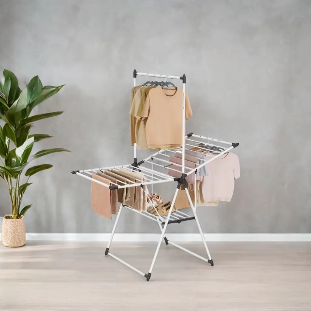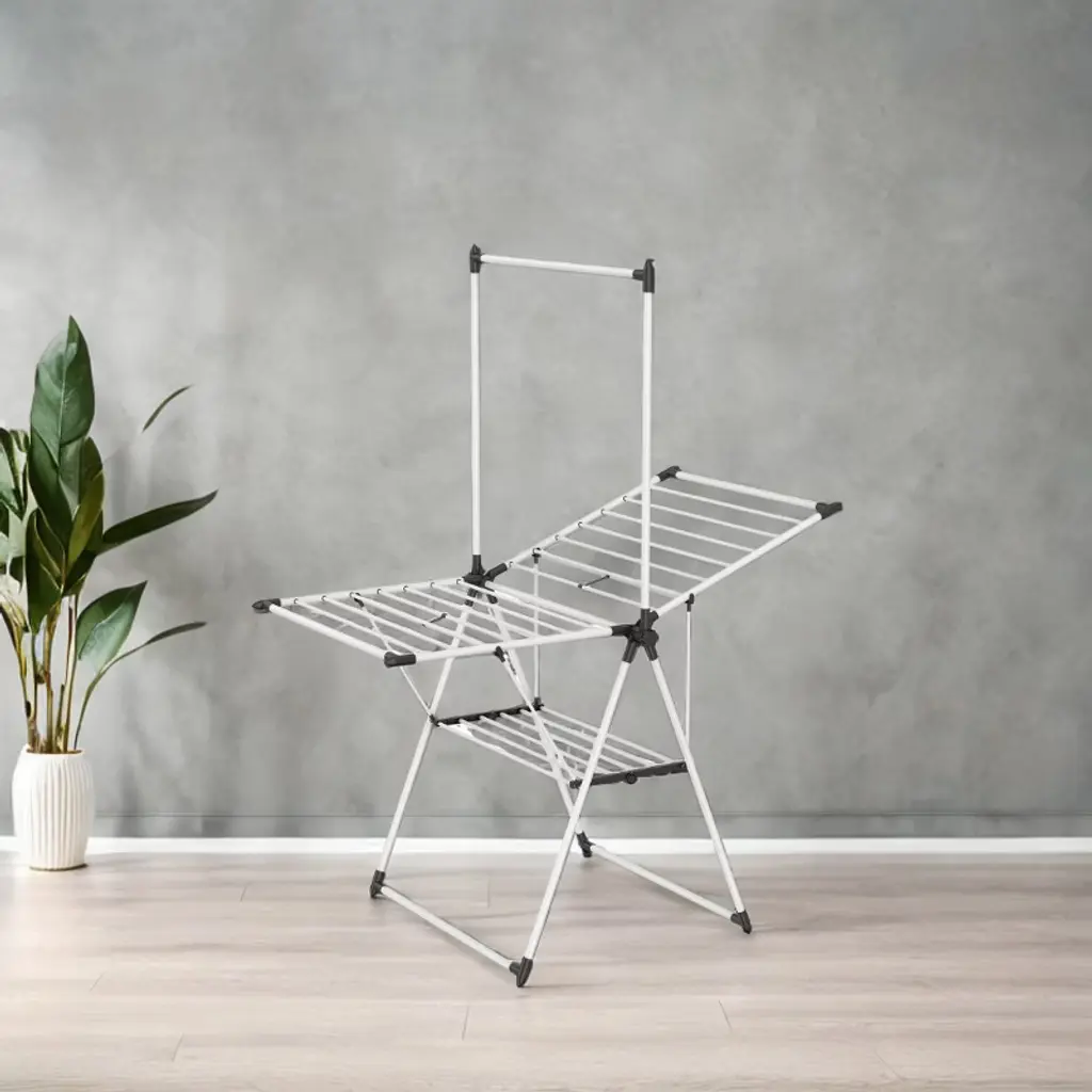 Maximize your laundry drying options with our Foldable Laundry Drying Rack. This 2-level, free-standing airer features an additional tall hanging bar, perfect for accommodating longer items. Its space-saving design ensures it fits snugly in any laundry room or balcony, and when not in use, it folds away for easy storage. The simply white finish complements any home decor, blending functionality with style. Whether you're dealing with daily laundry or larger items like bed linens, this clothes drying rack provides a versatile and efficient solution for air-drying all your garments.