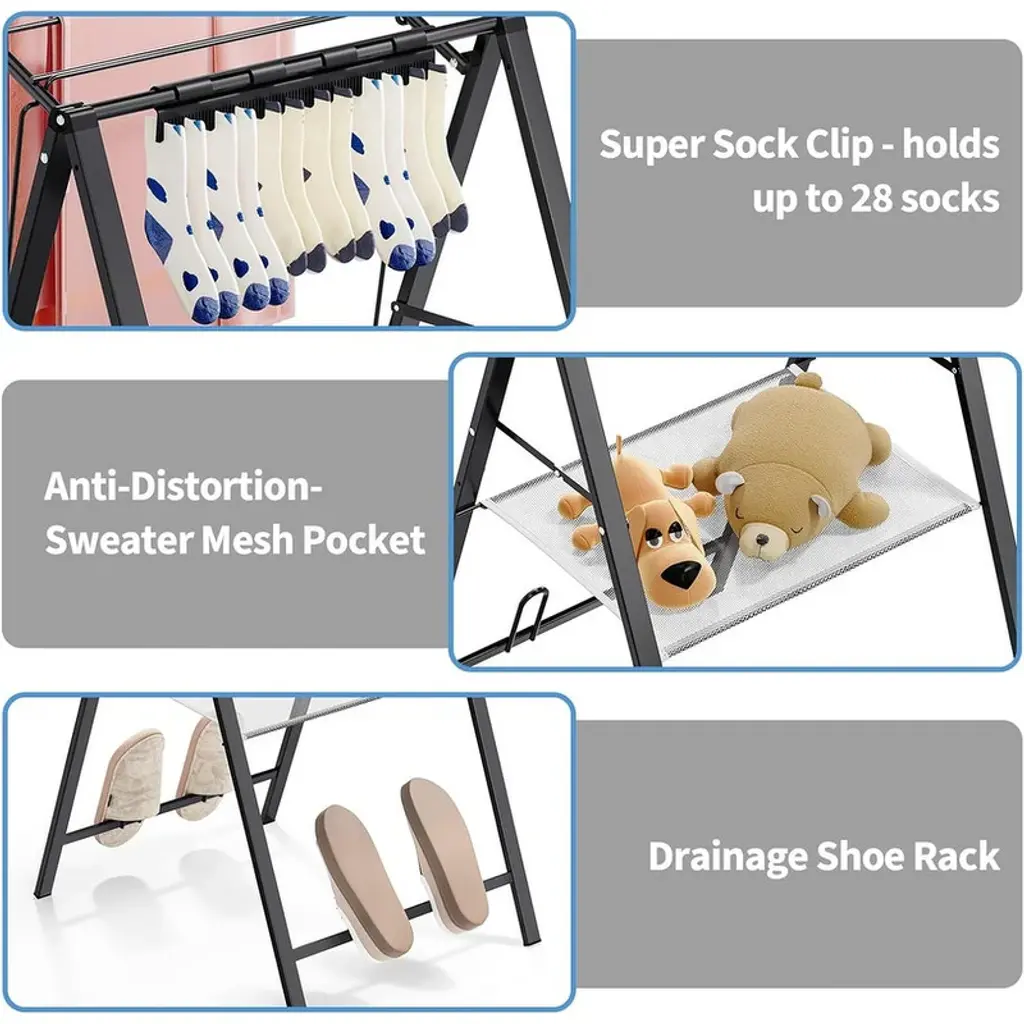 1. **Spacious Drying Area**: Featuring 22 rods and 62.6" of drying space, this rack provides ample room to hang an entire load of laundry without cluttering your living space. 2. **Designed for Delicates**: Equipped with a mesh shelf for flat drying, it's perfect for items that can't be tumble dried, ensuring they maintain their shape. 3. **Foldable & Adjustable**: The gullwing design allows for easy folding and height adjustments, accommodating different drying needs and making it simple to store. 4. **Superior Build Quality**: Made from rust-resistant materials, this drying rack is durable enough for outdoor use and provides a reliable solution for all your drying tasks. 5. **Efficient Air Circulation**: Designed to promote airflow, this drying rack speeds up drying times while helping to prevent dampness and odors.