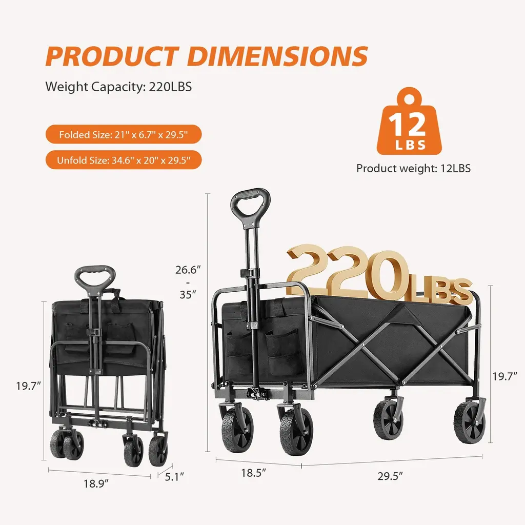 Foldable Picnic Wagon Cart With Drink Holders, Large Capacity Utility Cart For Outdoors, Shopping, And Travel - Small - Black