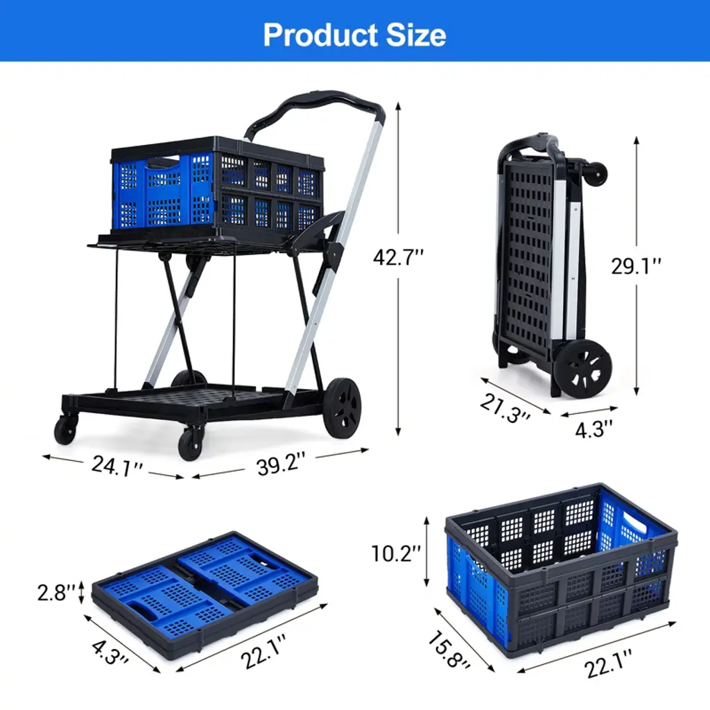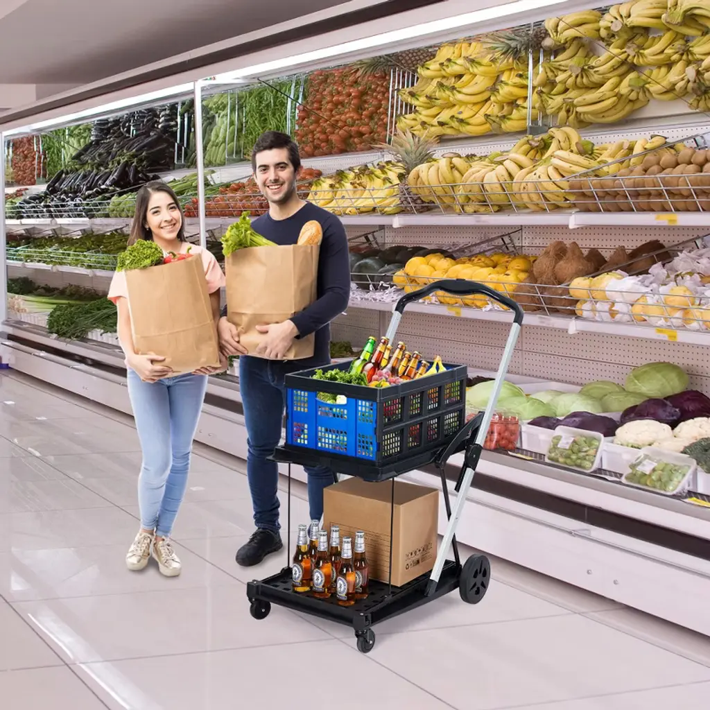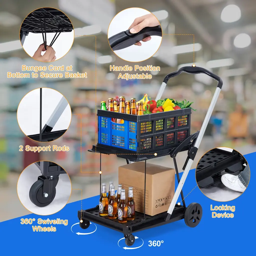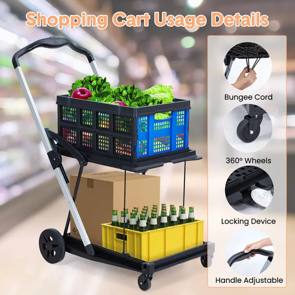 Foldable Shopping Carts for Groceries, 2-Tier Collapsible Grocery Carts with Wheels and Removable Storage Crate, Aluminum Frame Folding Trolley for Shopping, Picnic and Office