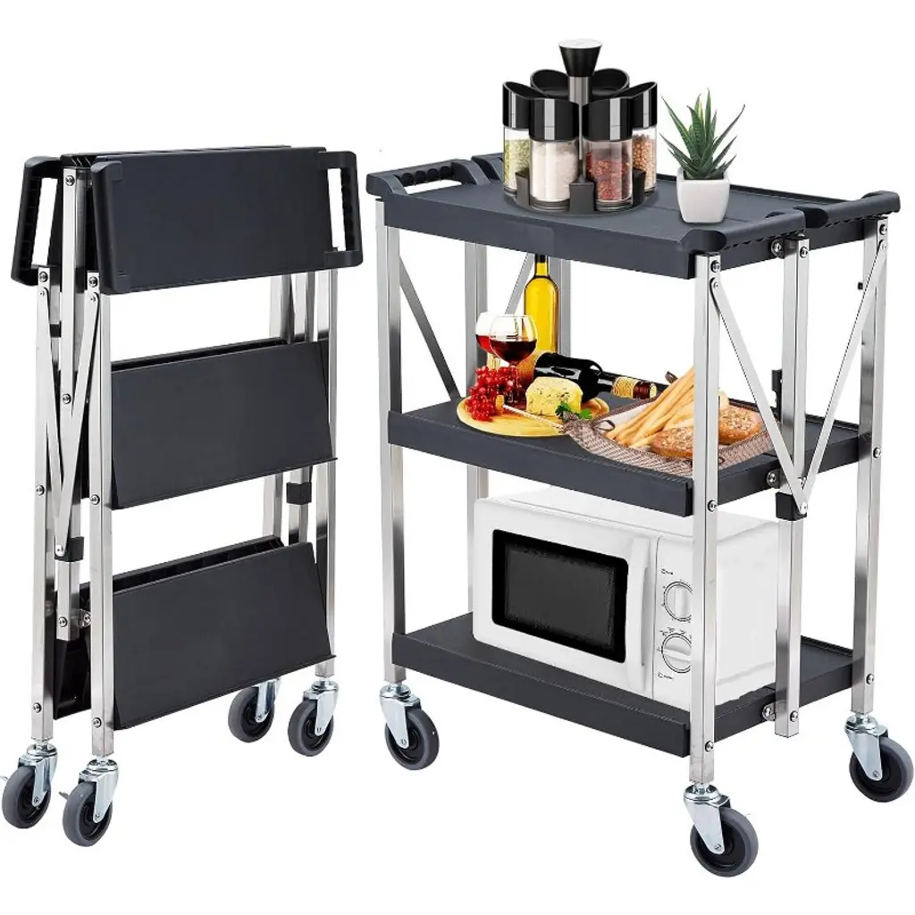 Experience effortless organization with this 3-tier foldable stainless steel service cart. Crafted from heavy-duty, corrosion-resistant steel, it handles heavy loads with ease and offers quiet gliding thanks to 360¡ã silent wheels. The cart folds horizontally in seconds, saving space and simplifying storage in tight locations. With safety-boosting support frames, lockable casters, and adaptable shelving, this versatile trolley is perfect for workshops, travel, and everyday household use.
