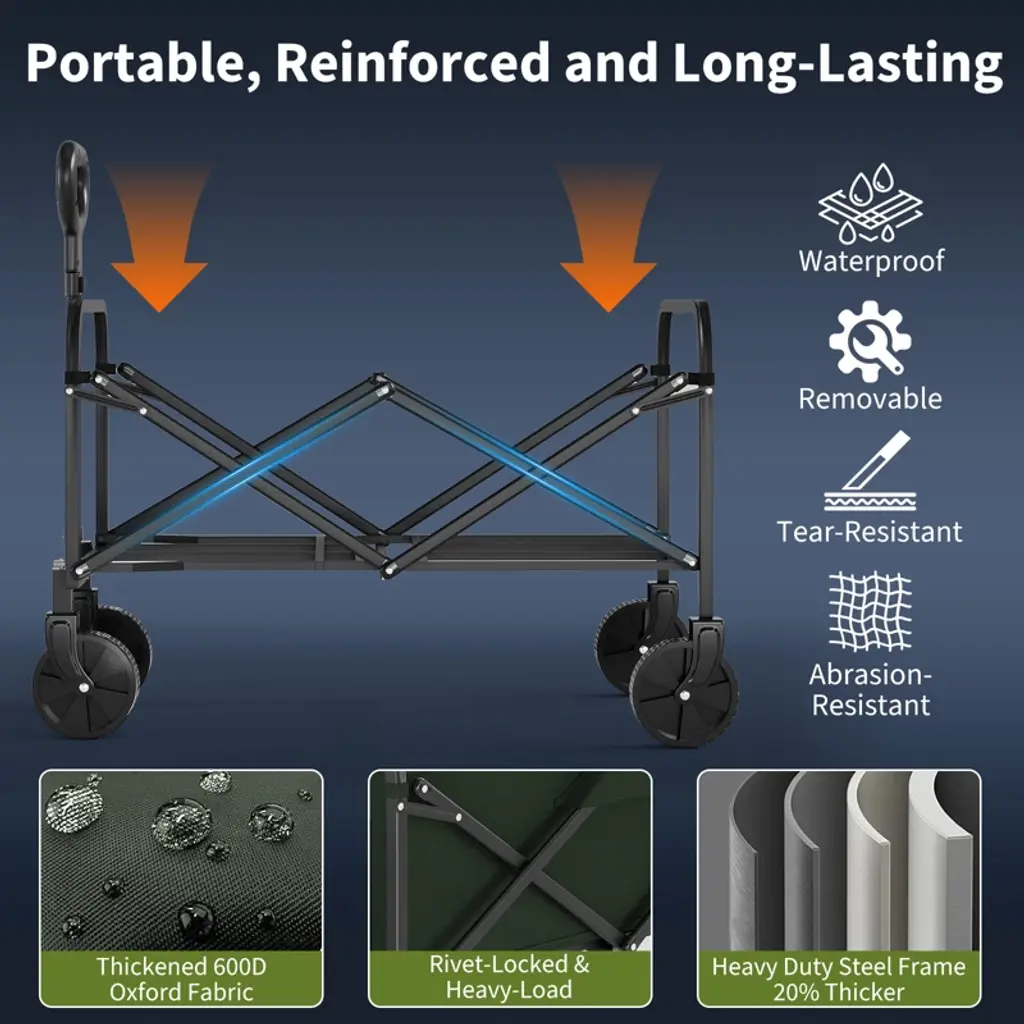 Heavy-Duty Utility Wagon - 380lb Capacity with 220L Storage & All-Terrain WheelsThis foldable wagon features a 600D Oxford fabric bin (removable/washable) on an alloy frame, supporting 380 lbs for groceries/camping. Key specs:360° wheels - rolls smoothly on sand/grassAdjustable handle - 90° height adjustmentLightweight - 12 lbs, folds to 20"x6"x26"Extras - 2 cup holders & phone pocketsIdeal for outdoor adventures or store runs.