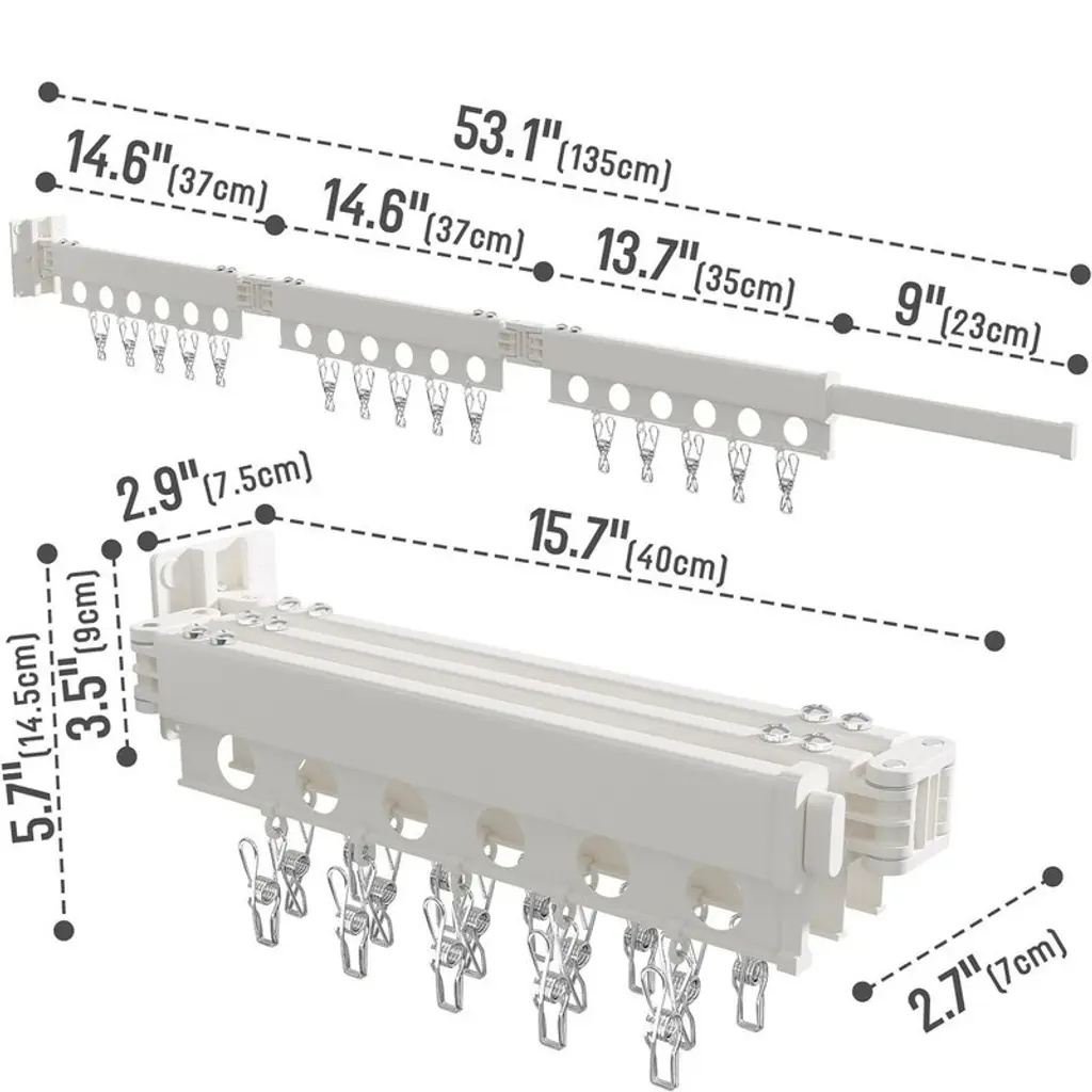 SPACE SAVING: The tri-fold design allows this drying rack to save space. When not drying clothes, it can be shrunk against the wall without occupying space. FREE CLOTHING CLIPS: 15 movable drying clips are included in the package for free. You can use it to clip socks or towels. HIGH QUALITY MATERIAL: Matte surface treatment, novel design, upscale appearance. MULTIPLE SCENARIOS: You can put this drying rack on the balcony, bathroom, laundry room or by the bedroom window. PERFORATED INSTALLATION: This folding drying rack is installed with perforated holes, which makes it more sturdy and firm. The installation manual is included in the package for easy installation.