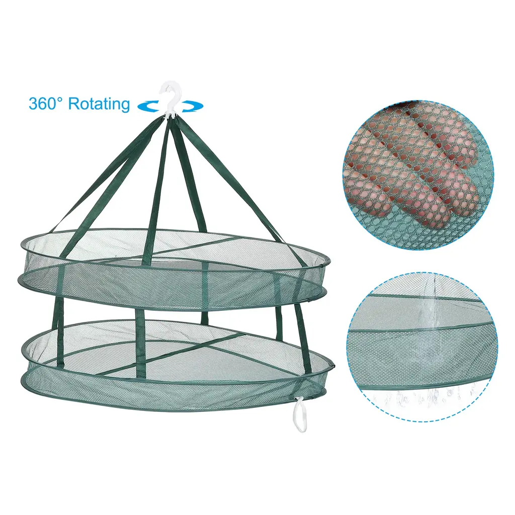 Our Folded Mesh Clothes Hanging Dryer - the perfect solution for drying your clothes efficiently and conveniently. This double tier sweater drying rack provides ample space for all your drying needs.SpecificationMaterial: Polyester, Stainless SteelDimension: 77cm x 61cm x 34cm/ 30.3 inch x 24 inch x 13.4 inch (L*W*H)Packing List: 1 x Folded Mesh Clothes Hanging DryerAdvantageWith its open-mesh design, this drying rack facilitates optimal airflow, allowing your clothes to dry quickly and evenly. Your clothes will be fresh and ready to wear in no time.Our durable plastic hook is designed to work seamlessly on standard shower rods, providing a reliable hanging solution. It can be easily locked in place, preventing it from blowing down due to wind.InstructionWhen not in use, this folding laundry drying rack can be easily folded and compactly stored away, saving valuable space in your home. Its lightweight and portable design also make it a great choice for those who frequently travel or have limited drying space.Note: Please note that this folded mesh clothes hanging dryer is specifically designed for drying clothes. Avoid overloading the rack with heavy items or placing pointed objects that may harm the mesh.