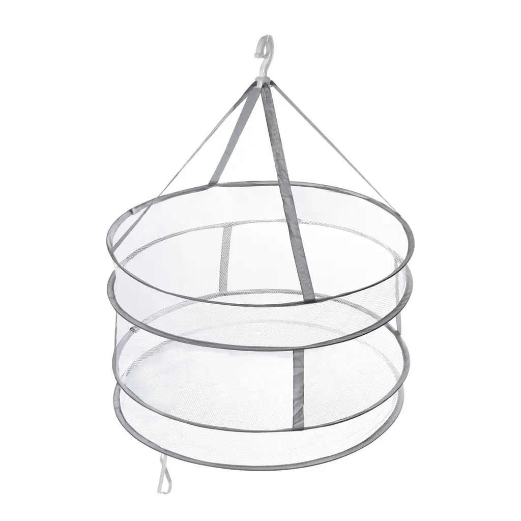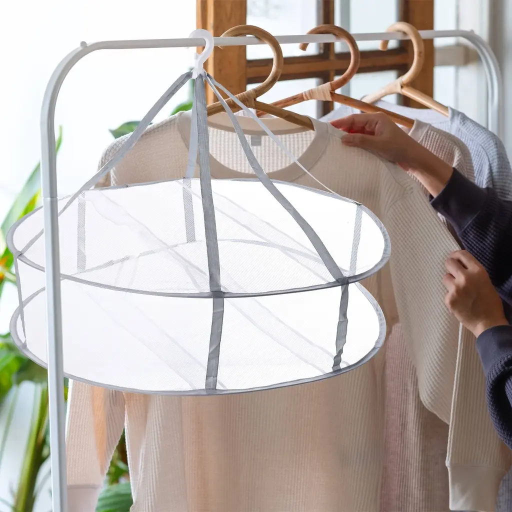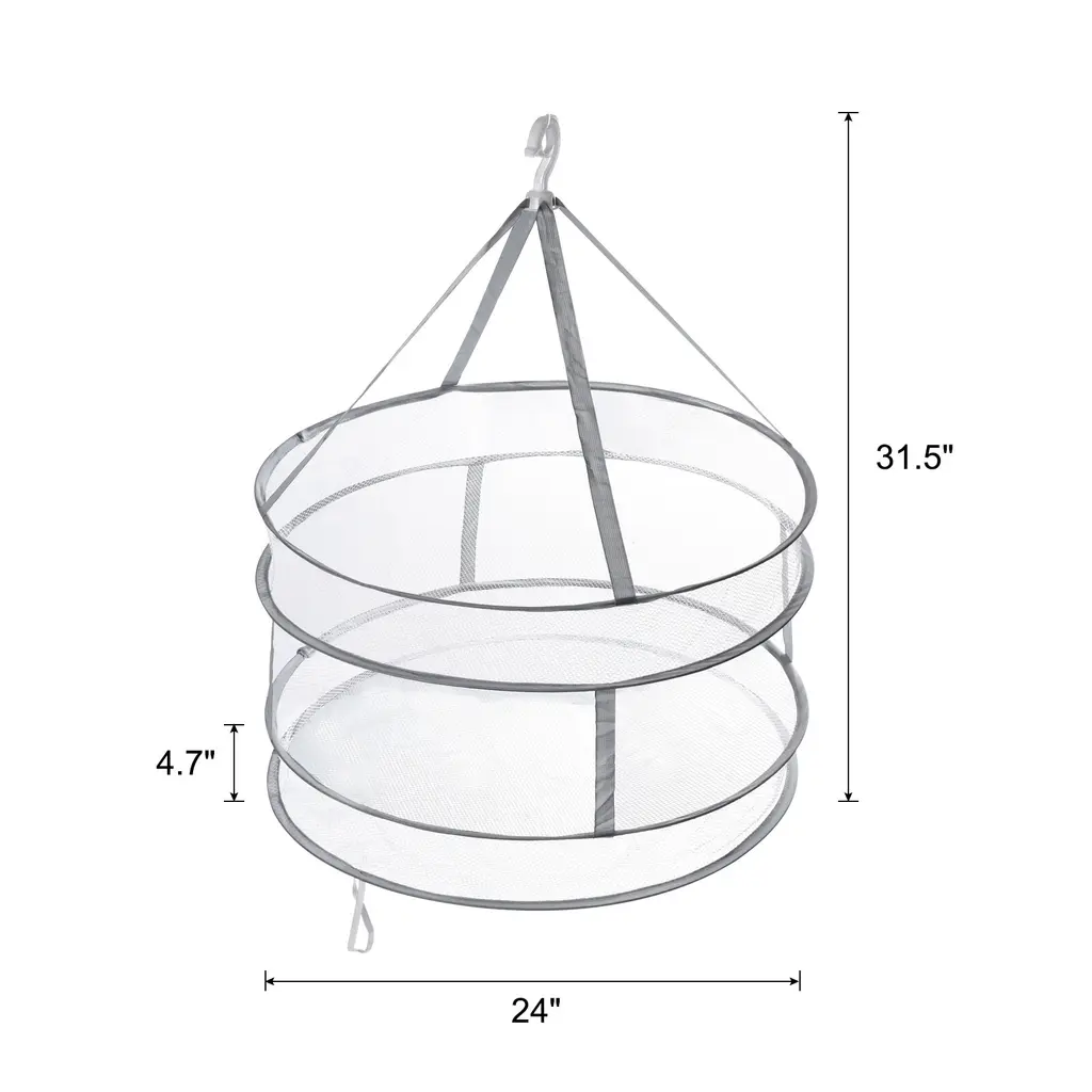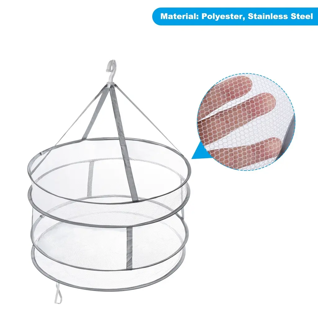 Our Folded Mesh Clothes Hanging Dryer - the perfect solution for drying your clothes efficiently and conveniently. This double tier sweater drying rack provides ample space for all your drying needs.SpecificationMaterial: PolyesterSingle-layer Height: 4.7"Open Dimension: 24" D x 31.5" H * 2 Layer.Packing List: 1 x Clothes Drying RackAdvantageWith its open-mesh design, this drying rack facilitates optimal airflow, allowing your clothes to dry quickly and evenly. Your clothes will be fresh and ready to wear in no time.Our durable plastic hook is designed to work seamlessly on standard shower rods, providing a reliable hanging solution. It can be easily locked in place, preventing it from blowing down due to wind.InstructionWhen not in use, this folding laundry drying rack can be easily folded and compactly stored away, saving valuable space in your home. Its lightweight and portable design also make it a great choice for those who frequently travel or have limited drying space.Note: Please note that this folded mesh clothes hanging dryer is specifically designed for drying clothes. Avoid overloading the rack with heavy items or placing pointed objects that may harm the mesh.