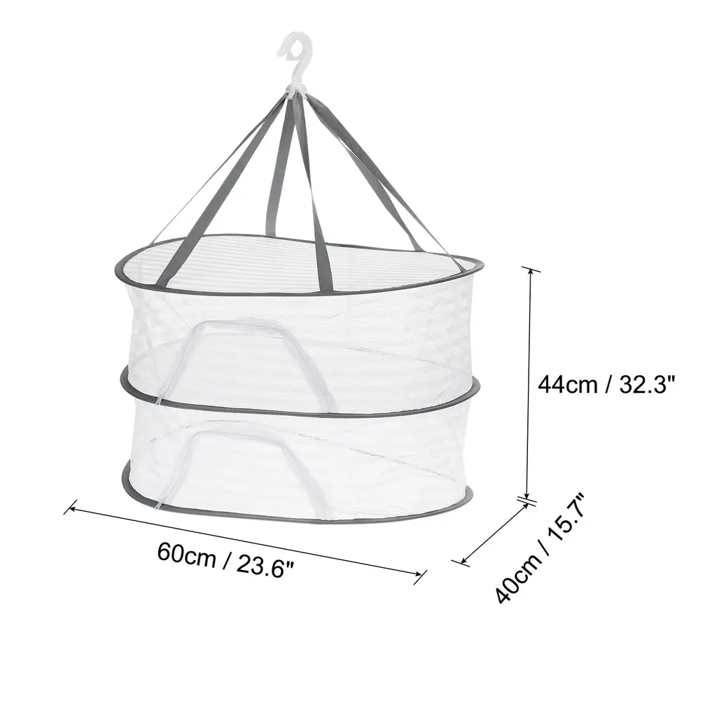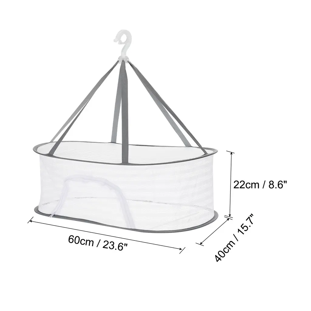 Our Folded Mesh Clothes Hanging Dryer - the perfect solution for drying your clothes efficiently and conveniently. This sweater drying rack provides ample space for all your drying needs.SpecificationMaterial: Polyester, Stainless SteelSingle-layer Height: 8.7"Open Dimension: 23.6" L x 15.7" W x 23.6" H * 1 Layer.Packing List: 1 x Clothes Drying RackAdvantageWith its open-mesh design, this drying rack facilitates optimal airflow, allowing your clothes to dry quickly and evenly. Your clothes will be fresh and ready to wear in no time.Our durable plastic hook is designed to work seamlessly on standard shower rods, providing a reliable hanging solution. It can be easily locked in place, preventing it from blowing down due to wind.InstructionWhen not in use, this folding laundry drying rack can be easily folded and compactly stored away, saving valuable space in your home. Its lightweight and portable design also makes it a great choice for those who frequently travel or have limited drying space.Note: Please note that this folded mesh clothes hanging dryer is specifically designed for drying clothes. Avoid overloading the rack with heavy items or placing pointed objects that may harm the mesh.