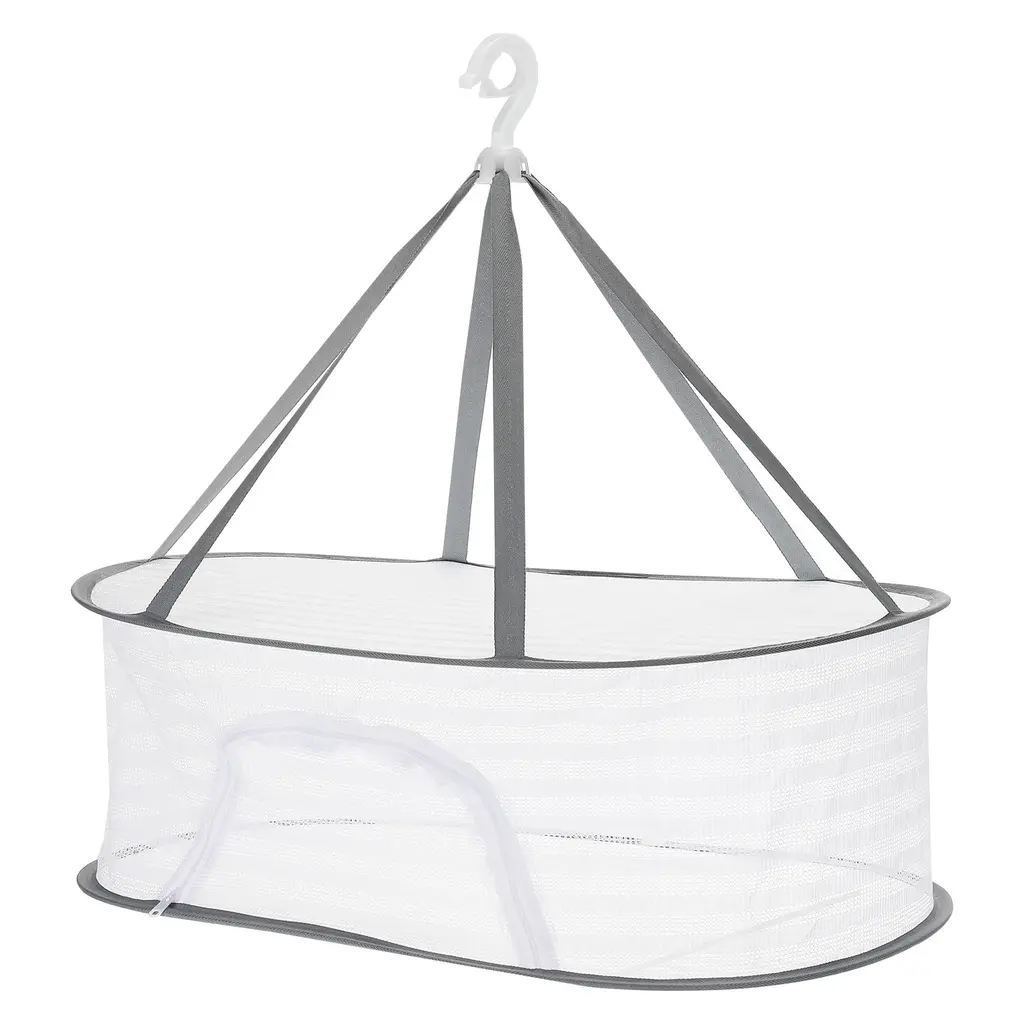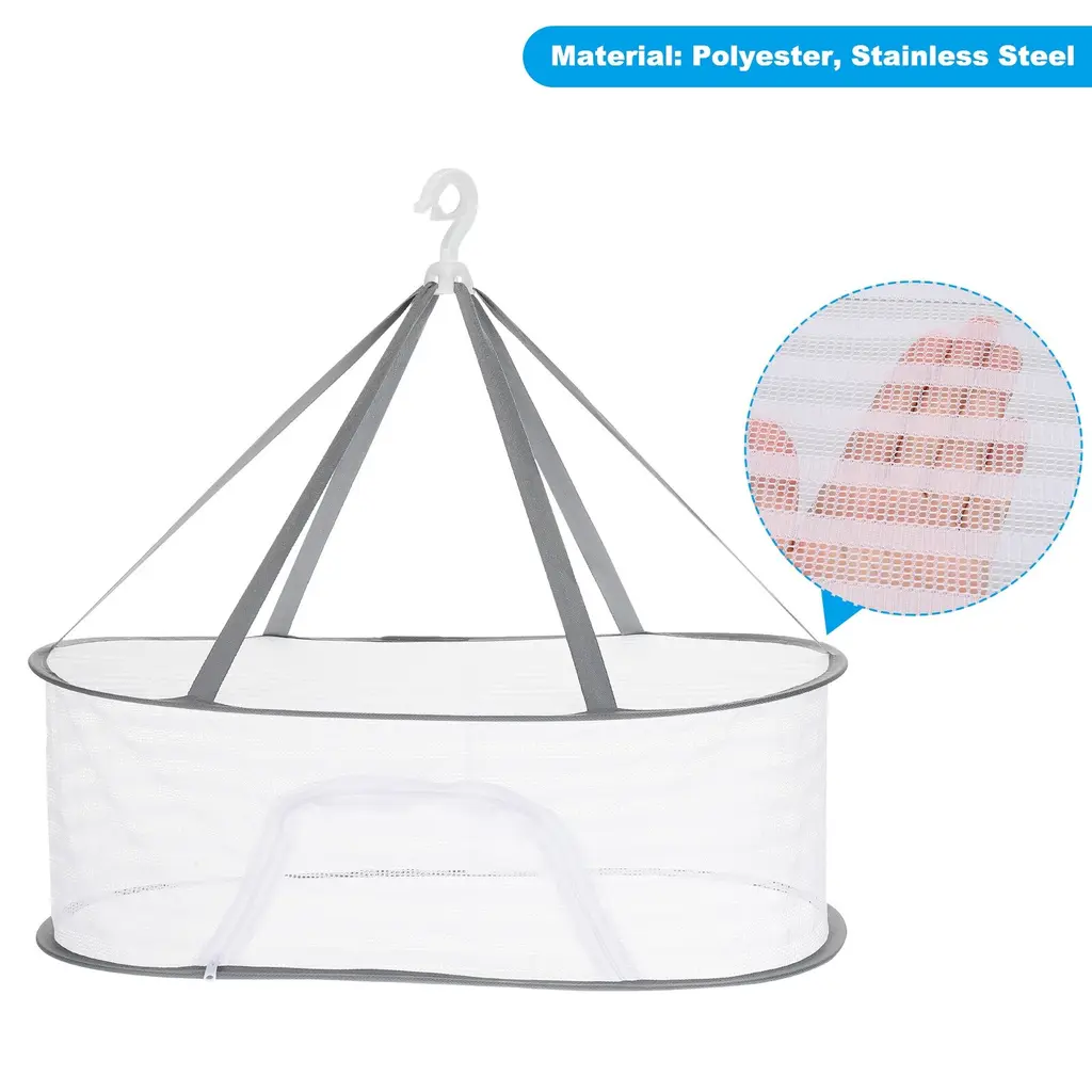 Our Folded Mesh Clothes Hanging Dryer - the perfect solution for drying your clothes efficiently and conveniently. This sweater drying rack provides ample space for all your drying needs.SpecificationMaterial: Polyester, Stainless SteelSingle-layer Height: 8.7"Open Dimension: 23.6" L x 15.7" W x 23.6" H * 1 Layer.Packing List: 1 x Clothes Drying RackAdvantageWith its open-mesh design, this drying rack facilitates optimal airflow, allowing your clothes to dry quickly and evenly. Your clothes will be fresh and ready to wear in no time.Our durable plastic hook is designed to work seamlessly on standard shower rods, providing a reliable hanging solution. It can be easily locked in place, preventing it from blowing down due to wind.InstructionWhen not in use, this folding laundry drying rack can be easily folded and compactly stored away, saving valuable space in your home. Its lightweight and portable design also makes it a great choice for those who frequently travel or have limited drying space.Note: Please note that this folded mesh clothes hanging dryer is specifically designed for drying clothes. Avoid overloading the rack with heavy items or placing pointed objects that may harm the mesh.