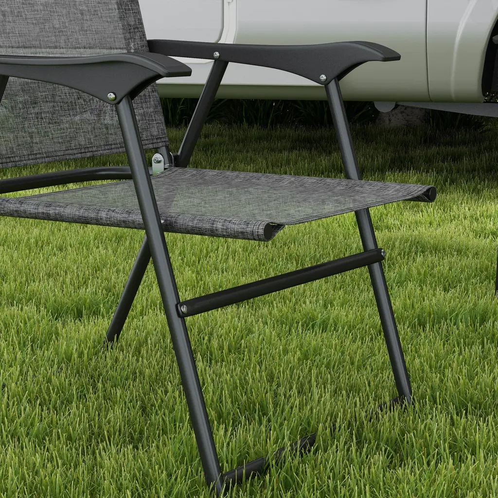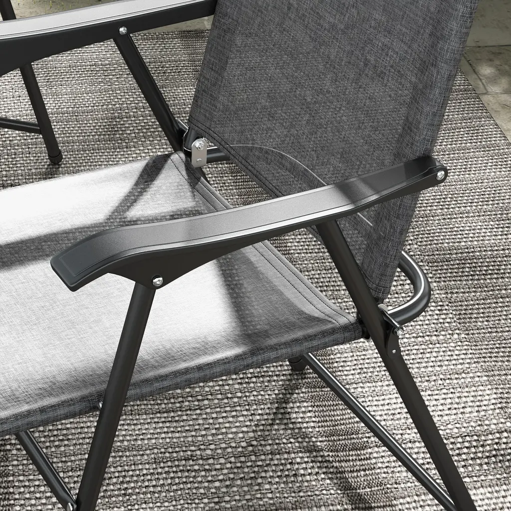 These folding patio chairs are a perfect choice for your outdoor adventures. The chairs are designed with a focus on durability and comfort. The breathable mesh fabric seat ensures a pleasant sitting experience even on hot days. The armrests provide added support and relaxation. The sturdy metal frame is not only reliable but also weatherproof and rustproof, allowing you to leave the chairs outdoors without worry. They are lightweight and easy to carry, making them ideal for camping, picnics, or simply enjoying your lawn. The chairs' folding design saves space when not in use, making storage a breeze. Whether you're spending time with family or friends, these chairs will enhance your outdoor moments.