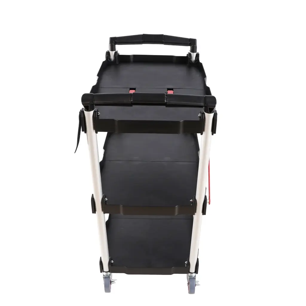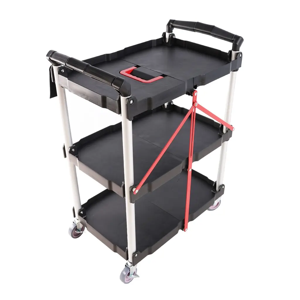 Ready to use in 1.5 seconds & Portable: No assembly required! Open the carton, unfold it and you can use it. Collapsible design. You can open or fold in seconds. The folding thickness is only about 8 inches and can be easily placed in the corner of your home, car trunk, office, etc. Net weight is only 16 pounds, easy to carry.Upgrade the lockable rotating wheel. With four 360-degree rotating casters with brakes, you can move the service cart smoothly, even when loaded with heavy loads. Worried about the service cart tipping over or slipping? Just hit the brakes.Rugged construction:Humanized design: non-slip handle, effectively increase friction, is more easy to push the service cart. The 3-level design allows you to move all your items at once, saving time and effort.Versatile. The 3-level design ensures sufficient storage space for different types of items. Suitable for workshops, restaurants, hotels, offices, garages, barber shops, repair shops, camping, fishing and so on.