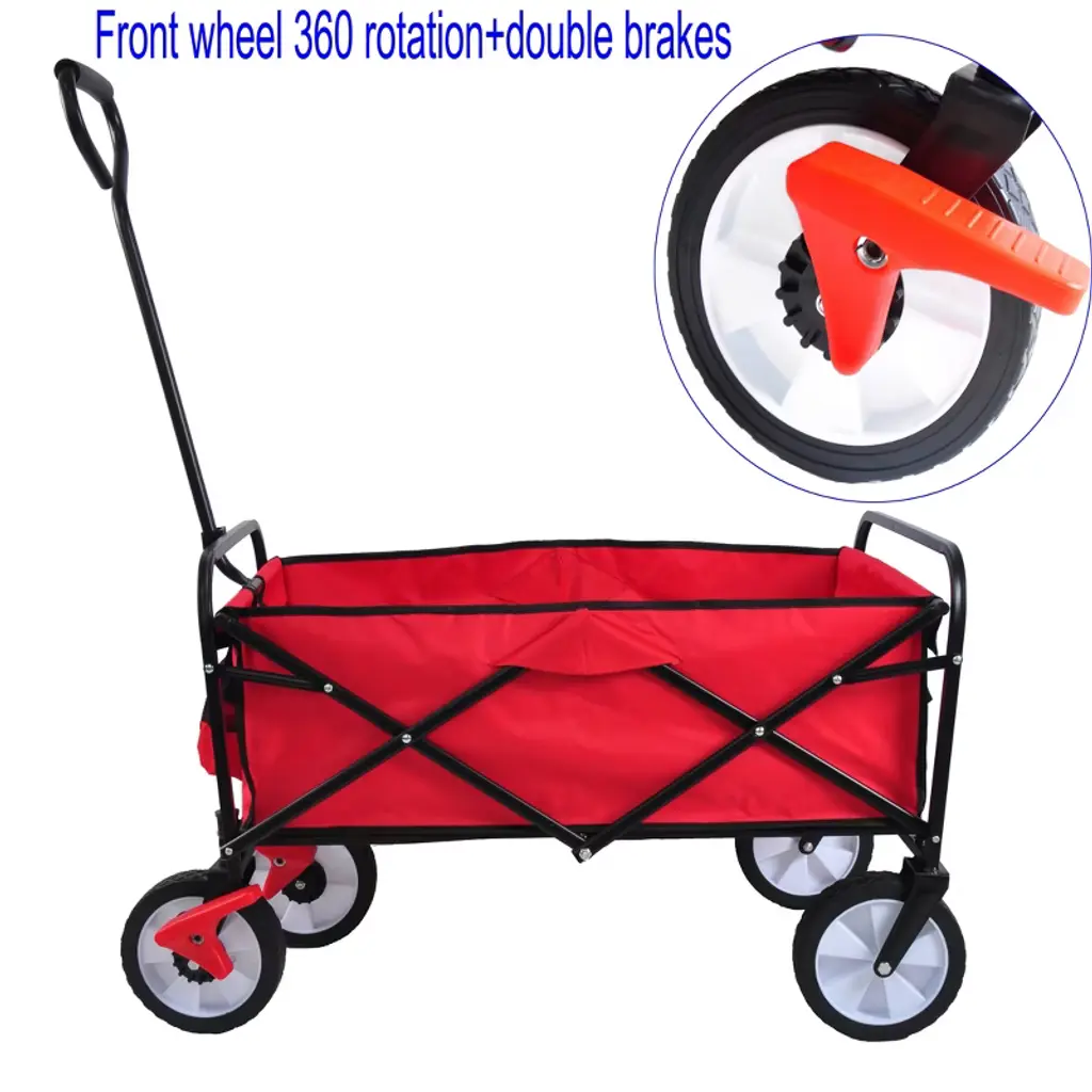 If you're a do it all, super parent you know the struggles of trying to transport your kids' toys and day to day necessities around at the beach or at a sporting event. For all those non-parents, you still know the difficulty of hauling groceries from the car to your home. No matter the scenario, this utility cart can handle it. From toys and groceries to everything in between, go with the Folding Outdoor Cart and lighten your load.Constructed with a heavy-duty steel frame and durable 600D polyester fabric, this cart will hold up no matter what job you throw at it. Unlike other copycat carts, this one folds compactly and stores easily in your trunk, garage, or closet, ensuring easy transport. Plus, the best part is it takes only seconds to set up and use. Lighten up your load and utilize this versatile cart for your everyday needs. It's safer to wear front wheel brakes.Heavy Duty:The wagon was built to last. The wagon is built using durable 600 Denier fabric. The heavy duty frame allows you to carry up to 150 pounds of gear with ease. Think of all the trips to and from the car you will save.Functional Features:All utility wagons come with an adjustable handle for effortless transport across multiple surfaces (pavement, grass, etc.) It also comes with 2 mesh cup holders to keep your beverages safe and sound.HIGH QUALITY:The utility wagon cart is made of strong steel and iron frame, fixed handle is firm and practical, wheel is suitable for hard road and beach. Durable and waterproof 600D Oxford cloth is easy to clean and has a long service life.