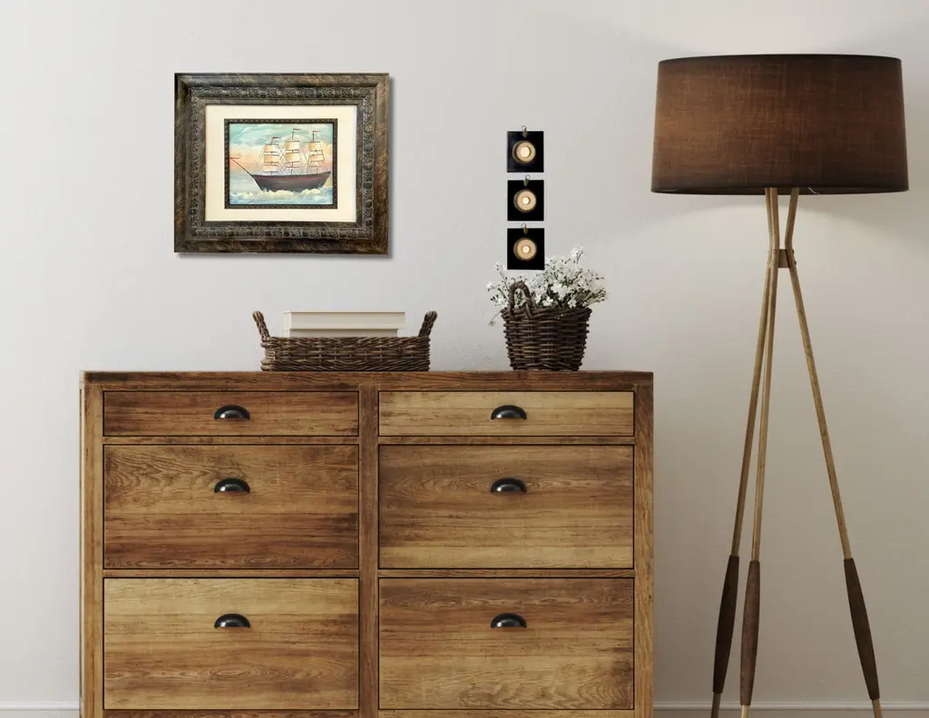 Folk art watercolor of a three-masted ship with red pennants, sailing through stylized waves beneath a pastel sky. Purchased on Route 1 in Maine from a prominent folk art collection, this unsigned piece echoes early American maritime traditions with a primitive charm. The heavily detailed frame with warm brown tones and aged finish adds a stately, nautical presence.