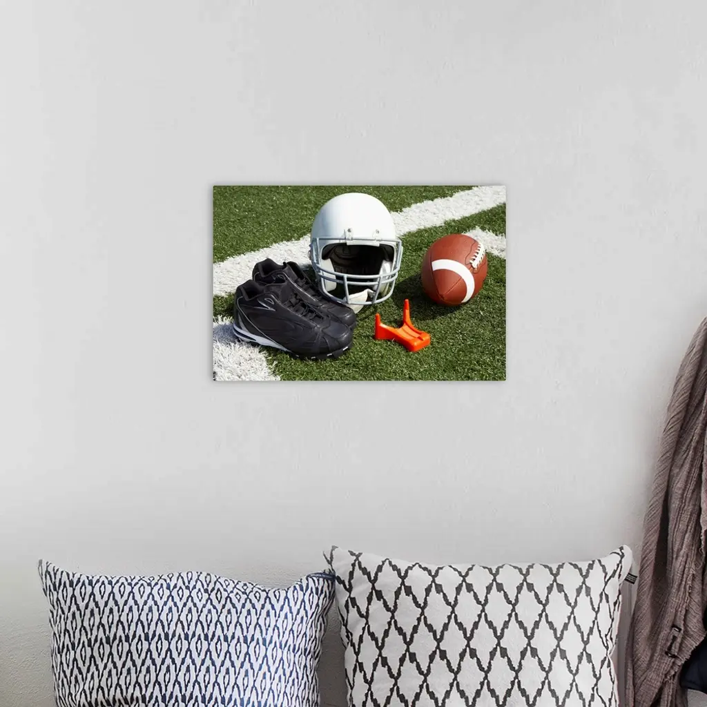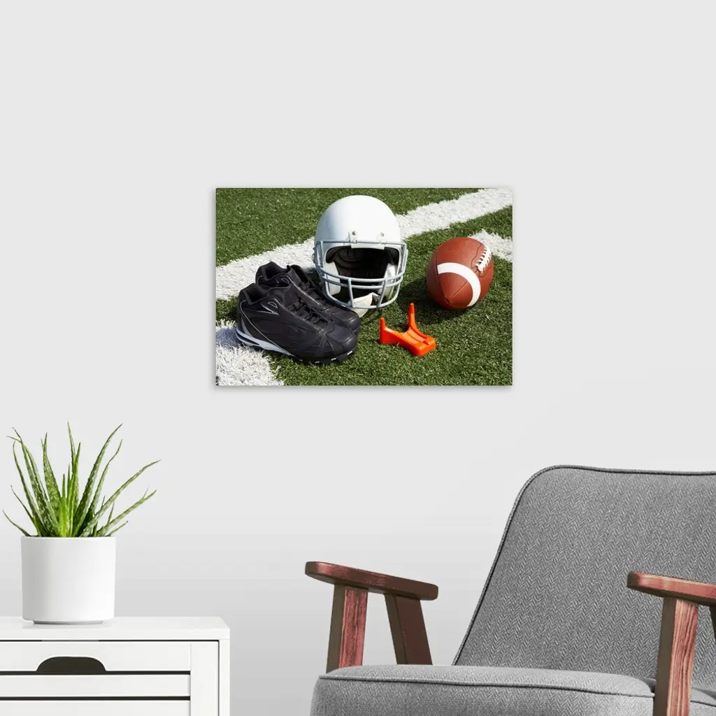 Football, football helmet, tee and shoes on football field wall art for home and office decor. Discover canvas art prints, photos, mural, big canvas art and framed wall art in GreatBigCanvas.com's varied collections.