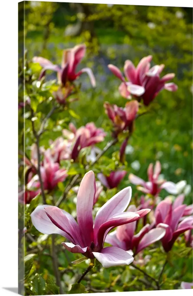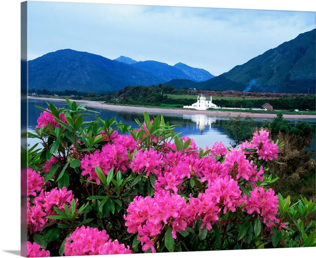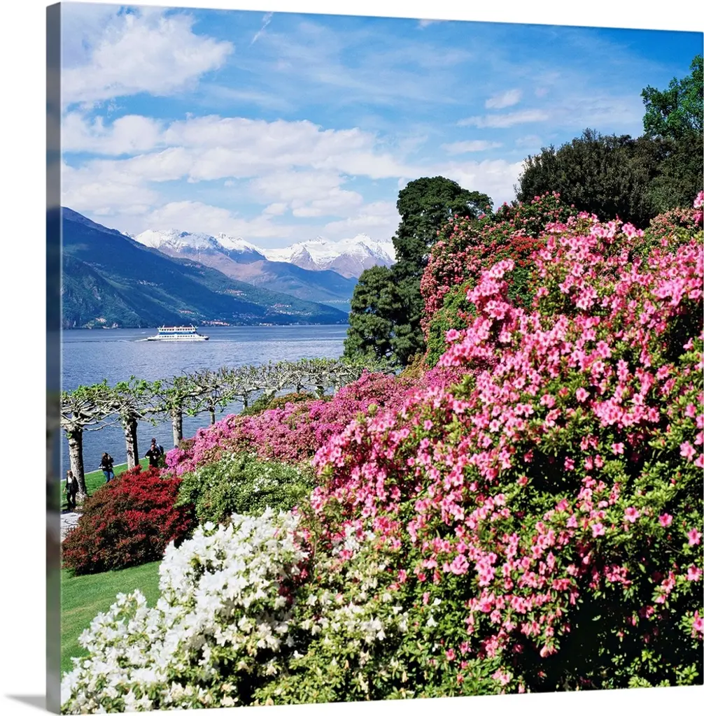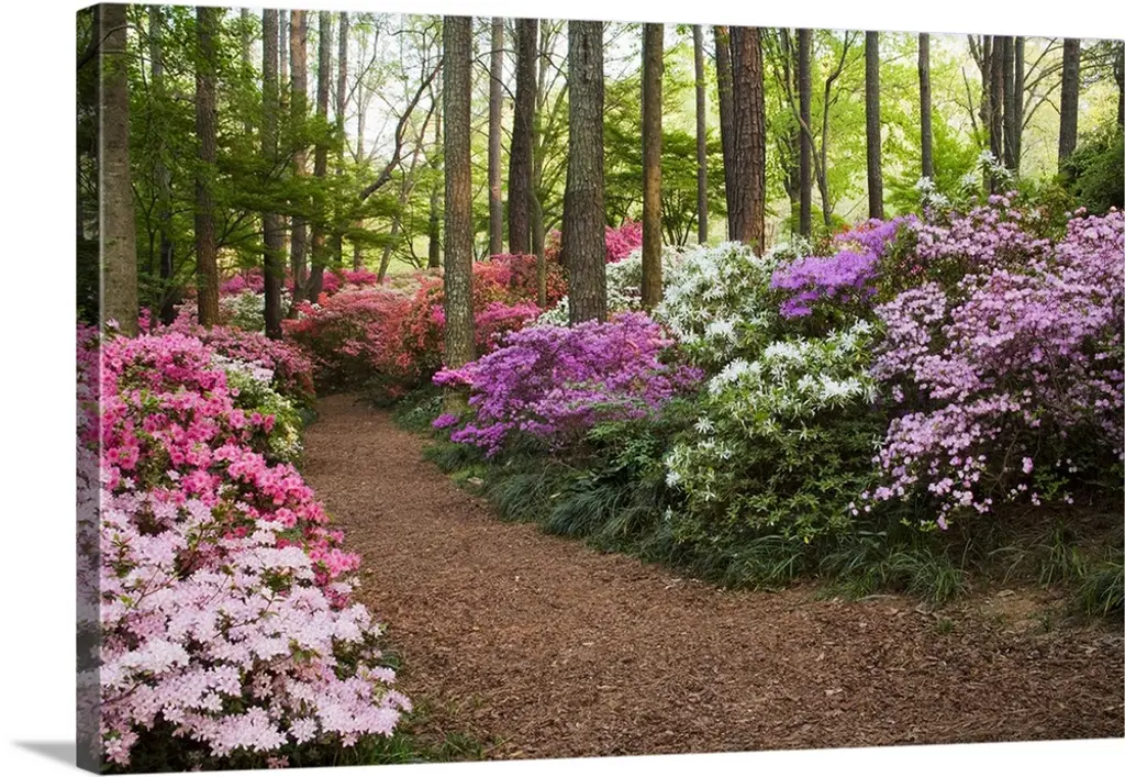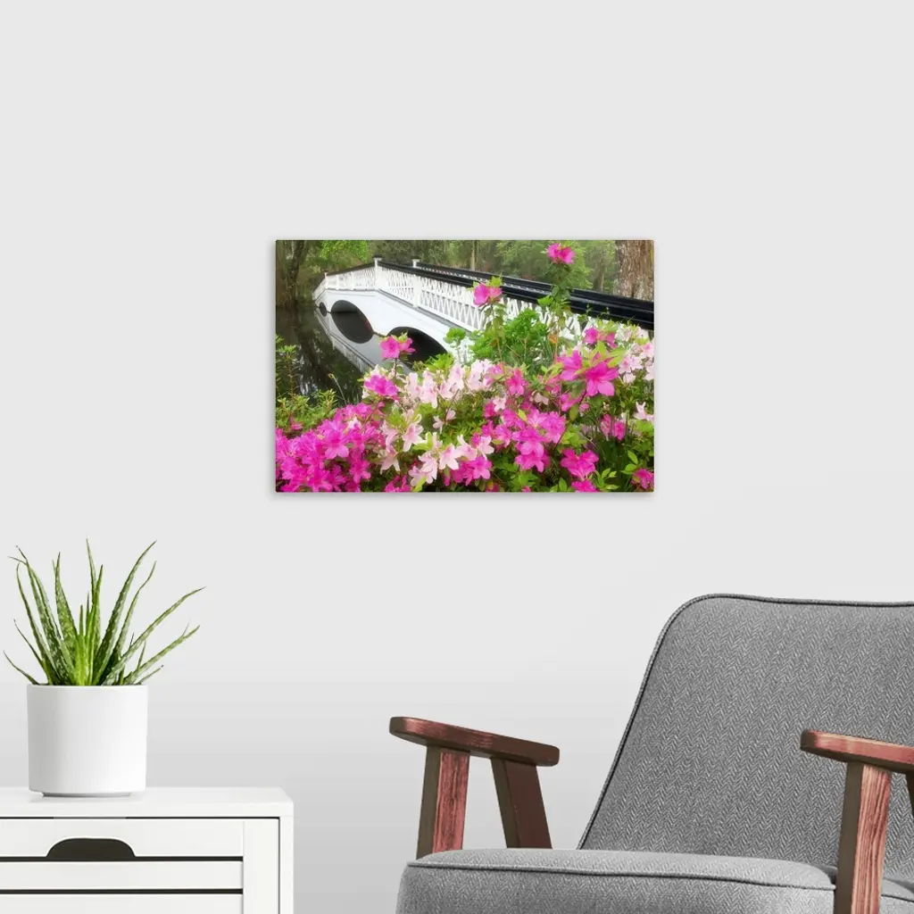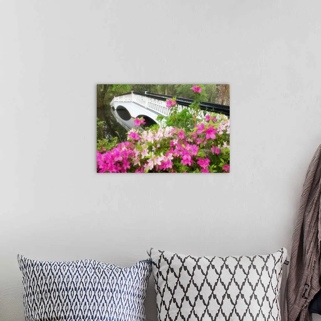 Decorative white bridge with fuchsia azaleas in a park in Charleston, South Carolina.