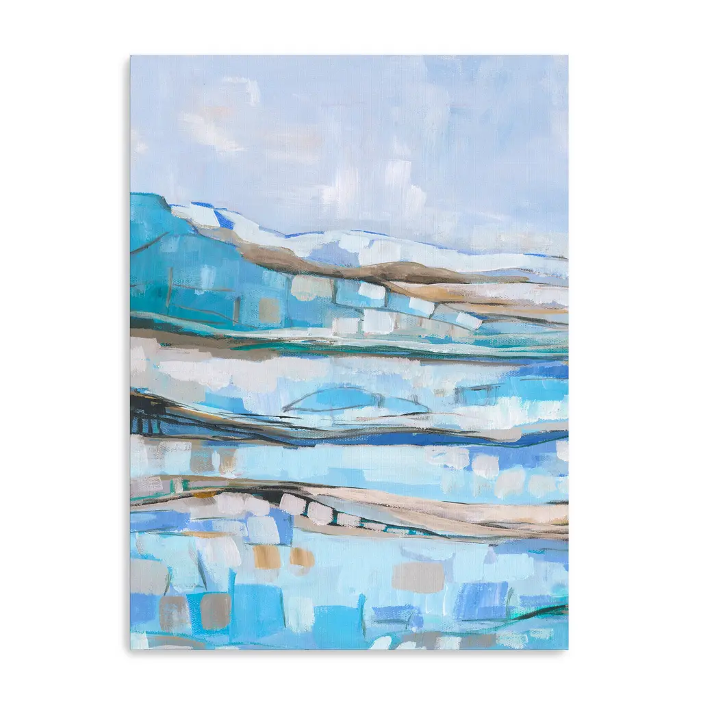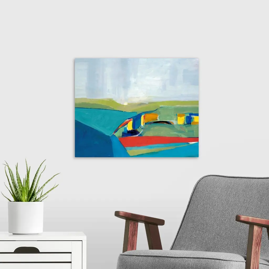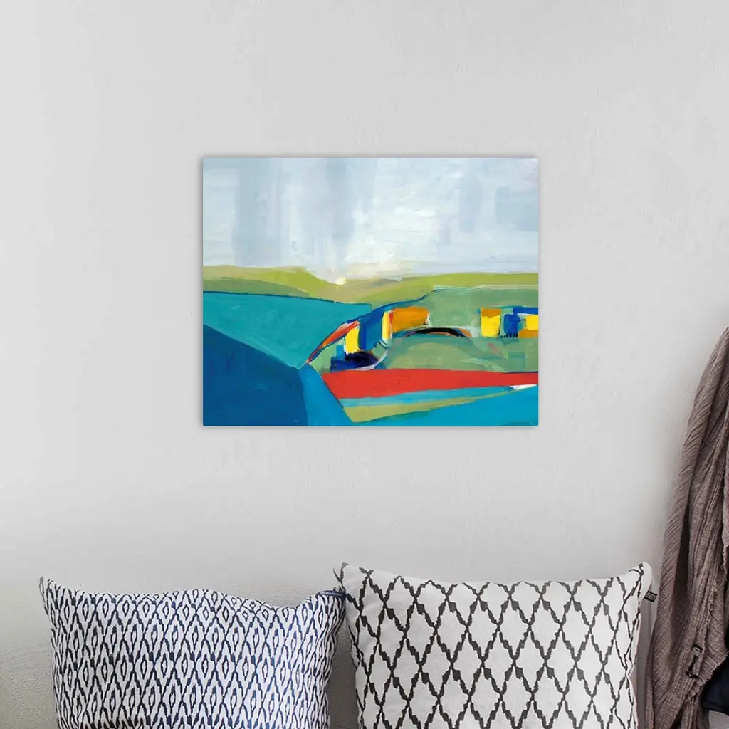 Abstract landscape of rolling hills in multiple colors such as blue, green, red, and yellow.