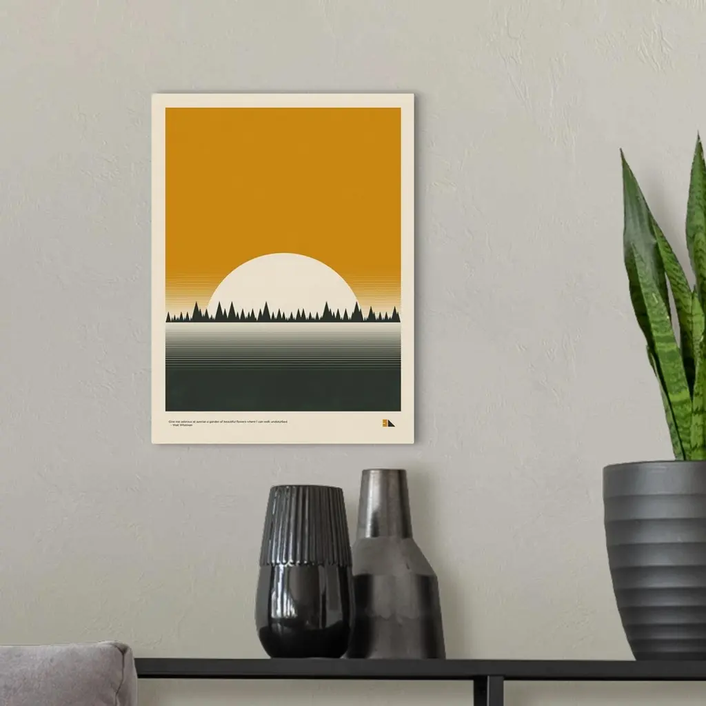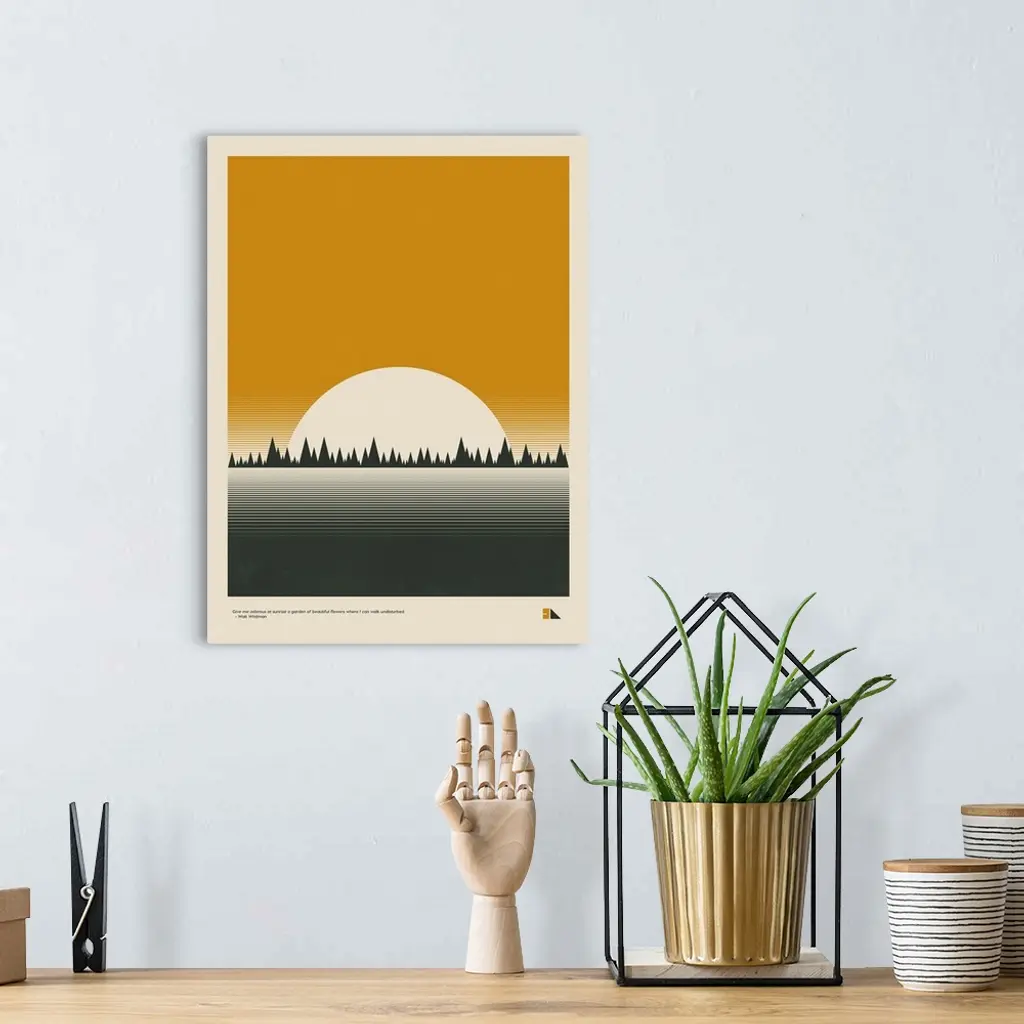 Modern graphic poster representing a forest landscape with the quote "Give me odorous at sunrise a garden of beautiful flowers where I can walk undisturbed." -Walt Whitman, written at the bottom.