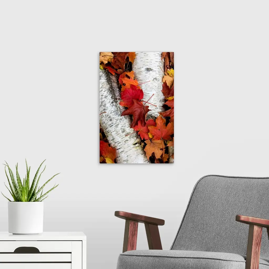 Vertical panoramic photograph of long narrow tree bark on ground surrounded by fall leaves.
