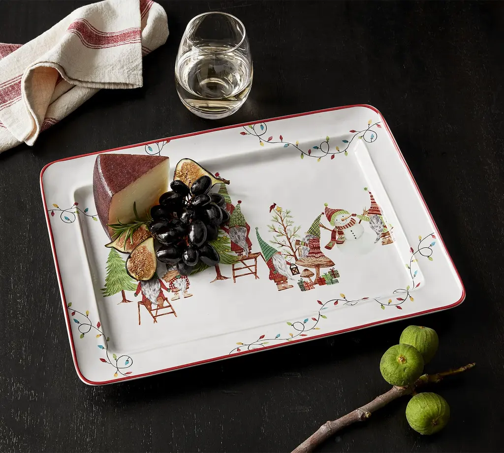 There’s gnome place like home this holiday season. Illustrating a fairytale scene, the artwork for this collection was originally painted by our in-house design team to bring a touch of wintry magic to your meals. The rectangular platter makes a merry presentation of hors d'oeuvres, side dishes, or even a small roast or main course.