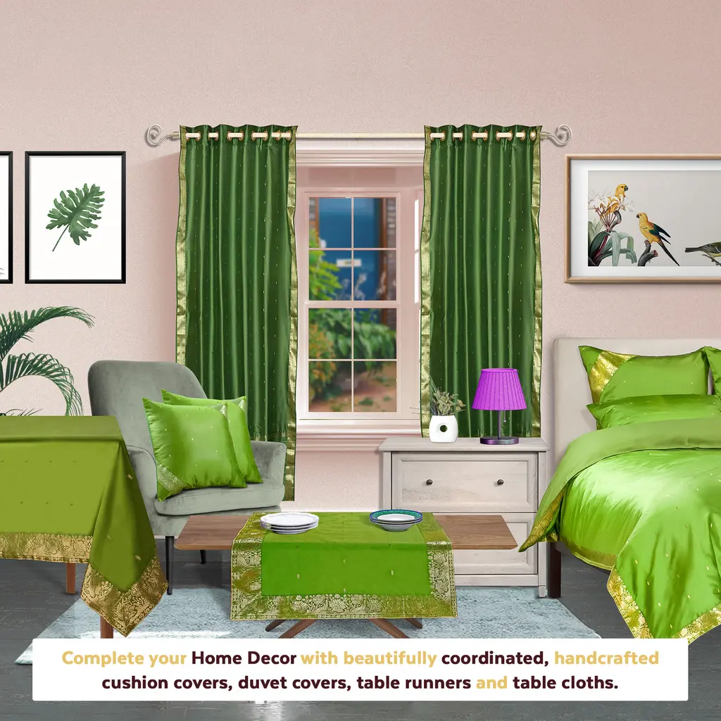 Ring-top drapery is sophisticated and contemporary. Ring-tops have decorative rings attached to the drapes. Rings create a pleated look that is crisp and modern. Sari Curtains / Drapes / Panels are the perfect choice for those looking for light, elegant drapes with a touch of luxury. It has smooth finish with a soft sheen and feels gentle and cool to the touch. Sheer curtains made of saris allow light in through windows but prevent people looking in when they are drawn. Story Behind the Art: The fabric of these curtains are weaved on a hand-loom in a small rural village in India and then hand-dyed. The artisans are a group of young hand-crafters who have moved from small villages to a big town in Central India and make various home decor items out of these exotic sari fabrics. This gives these wonderful artisans a way to have sustainable income via selling to the worldwide market on the internet. Your purchase supports local and home-based work where the artisans can easily tend to their families and pass these time-honoForest Green skills from one generation to the next.