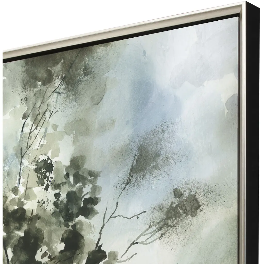 Trees stretch toward a stormy sky. Canvas is mounted in a warm silver floater frame with satin black side.