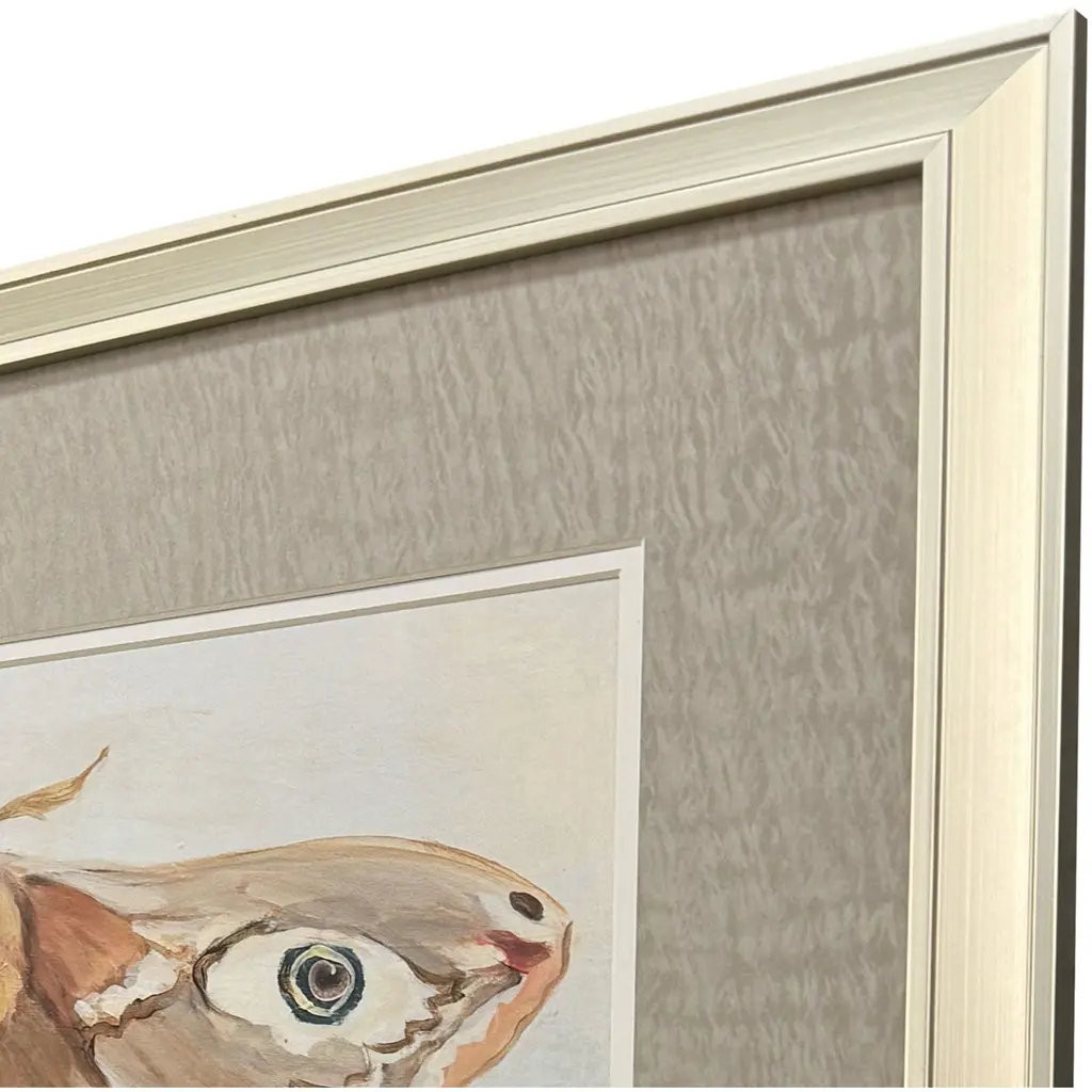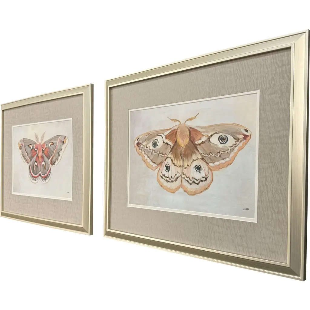 Traditional moth studies are double matted with a premium top mat. The art is framed in a champagne gold finish molding adding a luxurious touch.