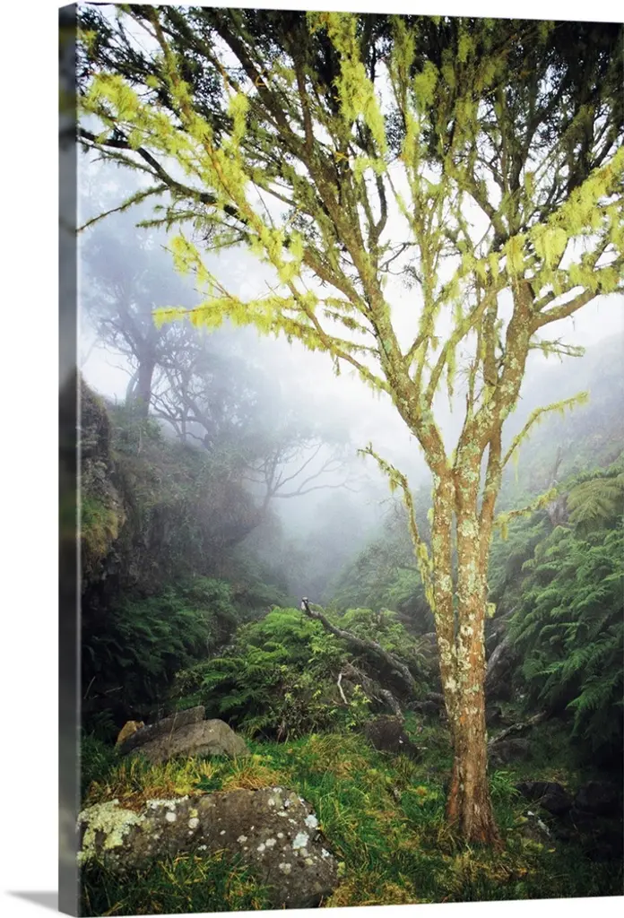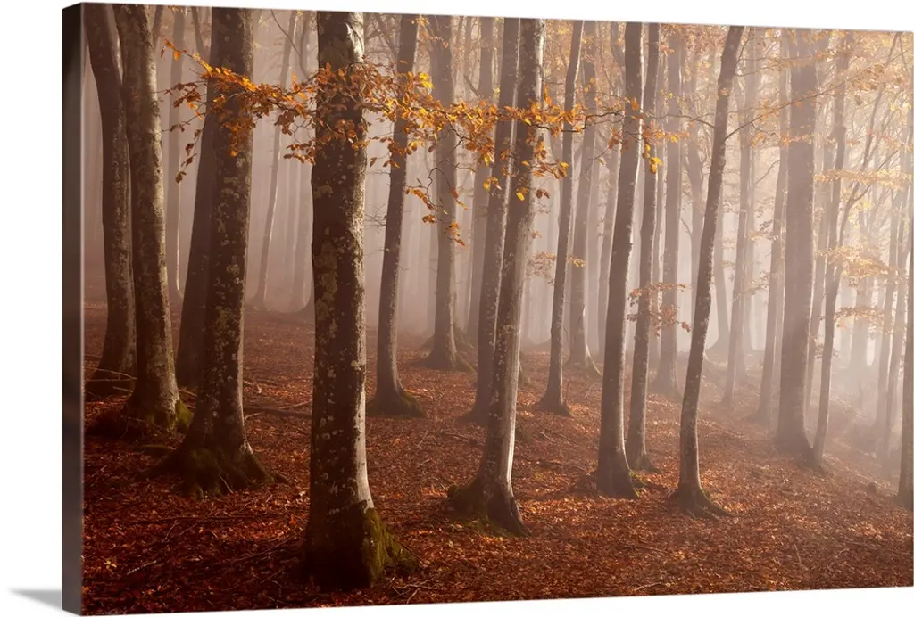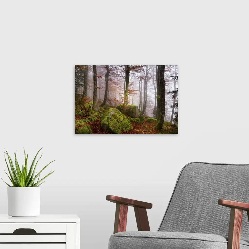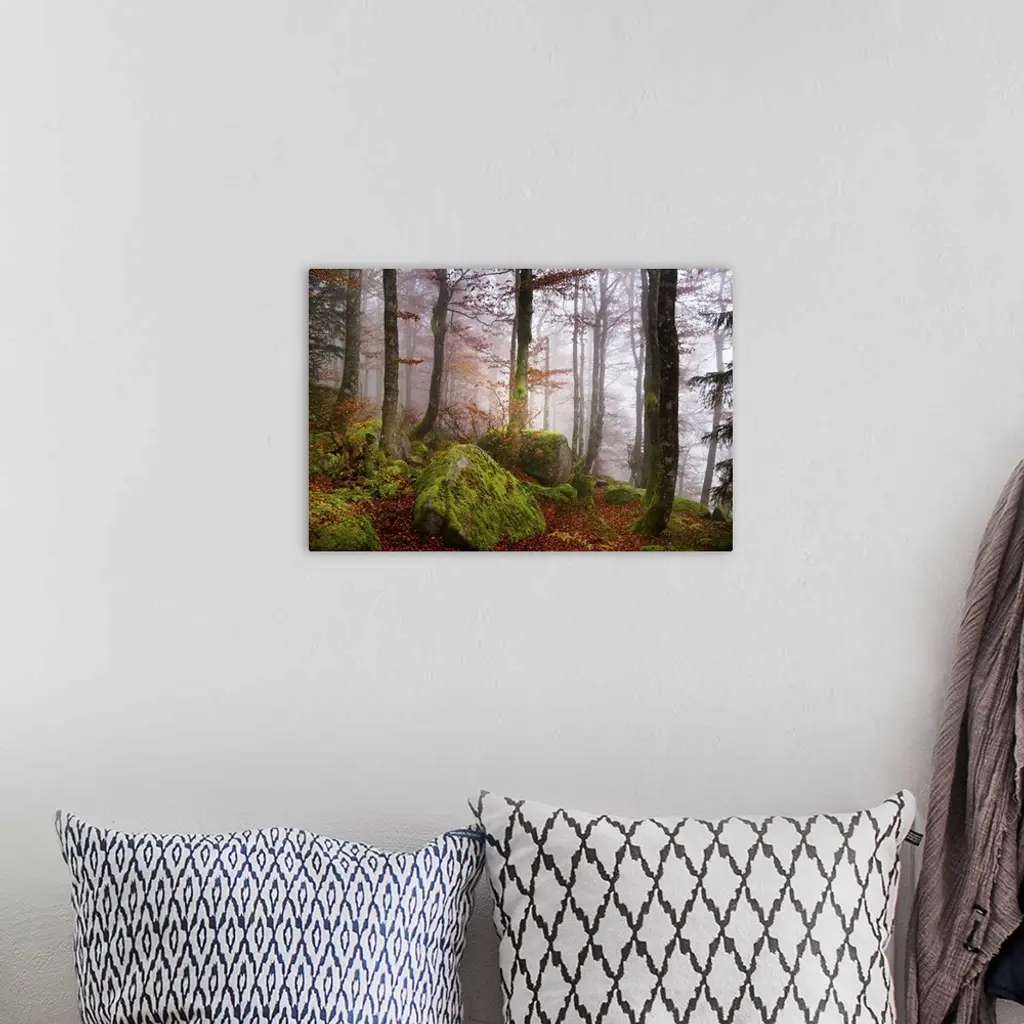 Light mist in a forest with mossy rocks and red autumn leaves.