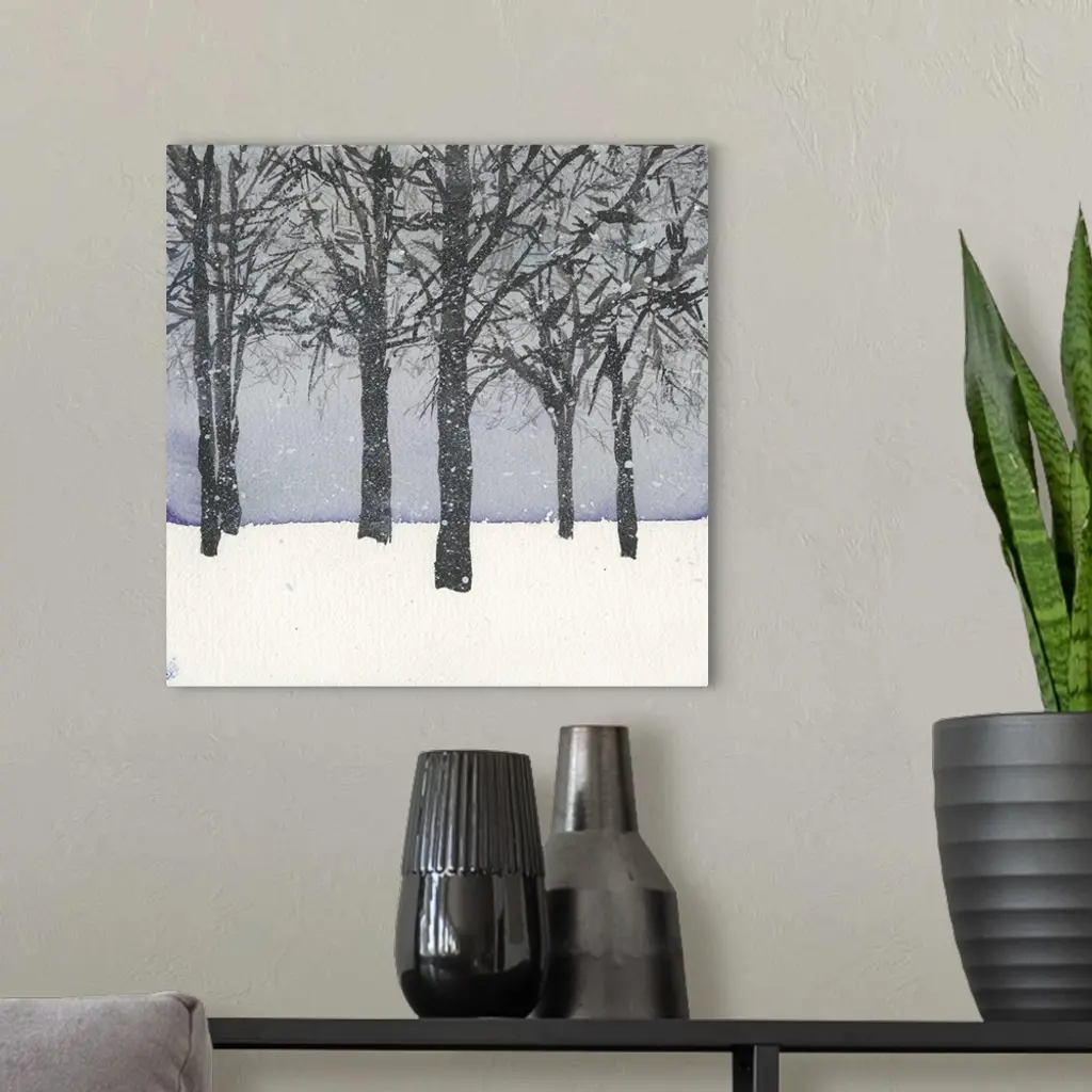A grove of trees in the snow with a pale blue sky.