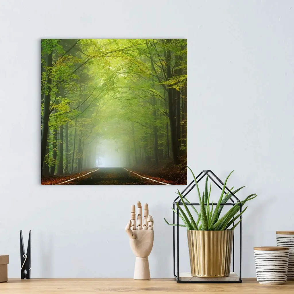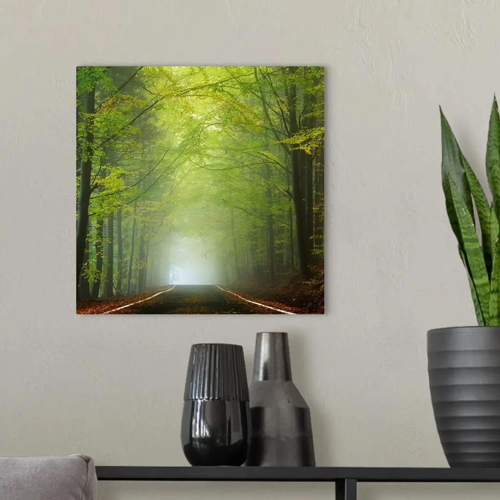 Photograph of a shrouded forest road with bright green foliage and dense fog in the distance.