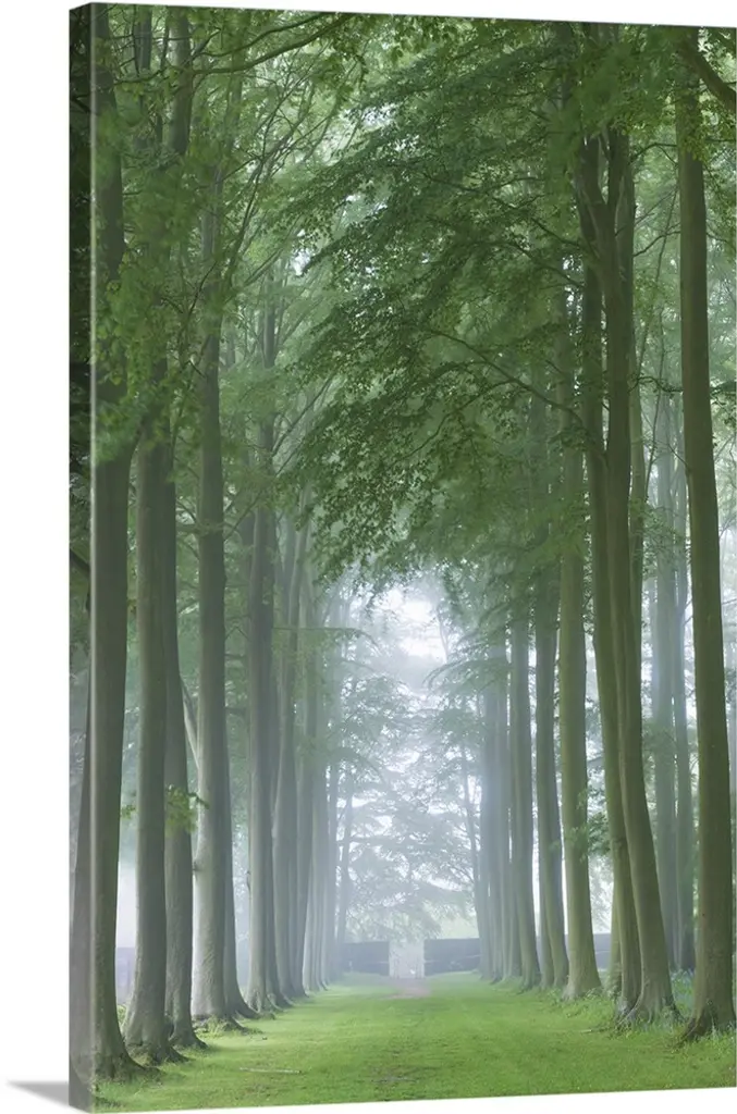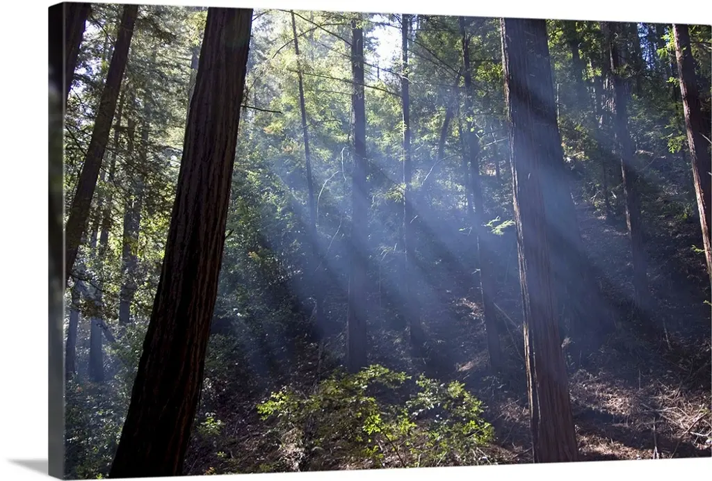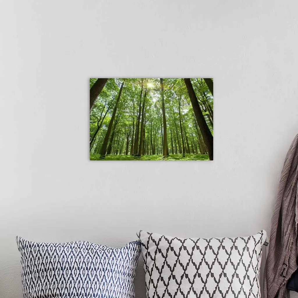Docor perfect for the home or office of a photograph taken inside a thick forest while looking up to the tops of the trees where the sun is shining through.