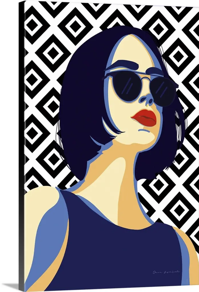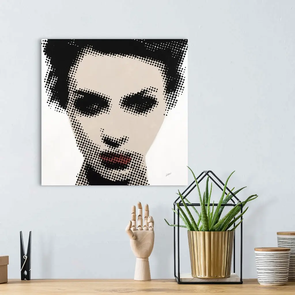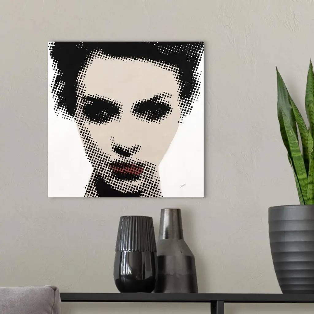 Square illustration of a woman's face created with black dots over beige and red paint on a white background.