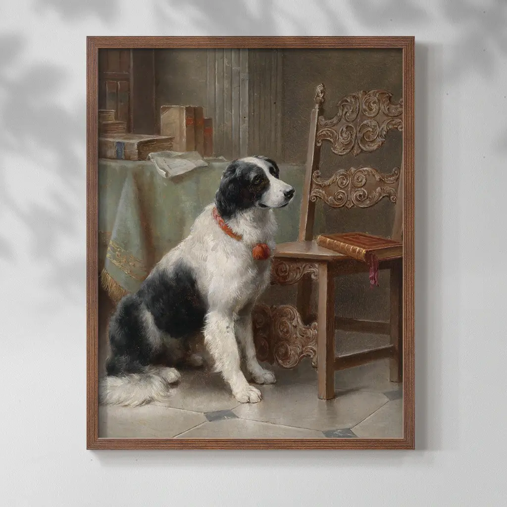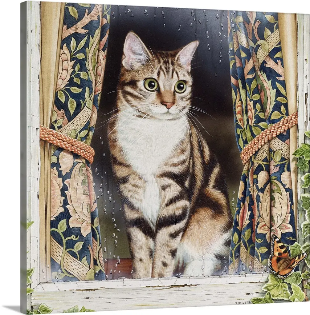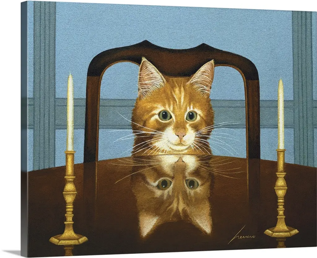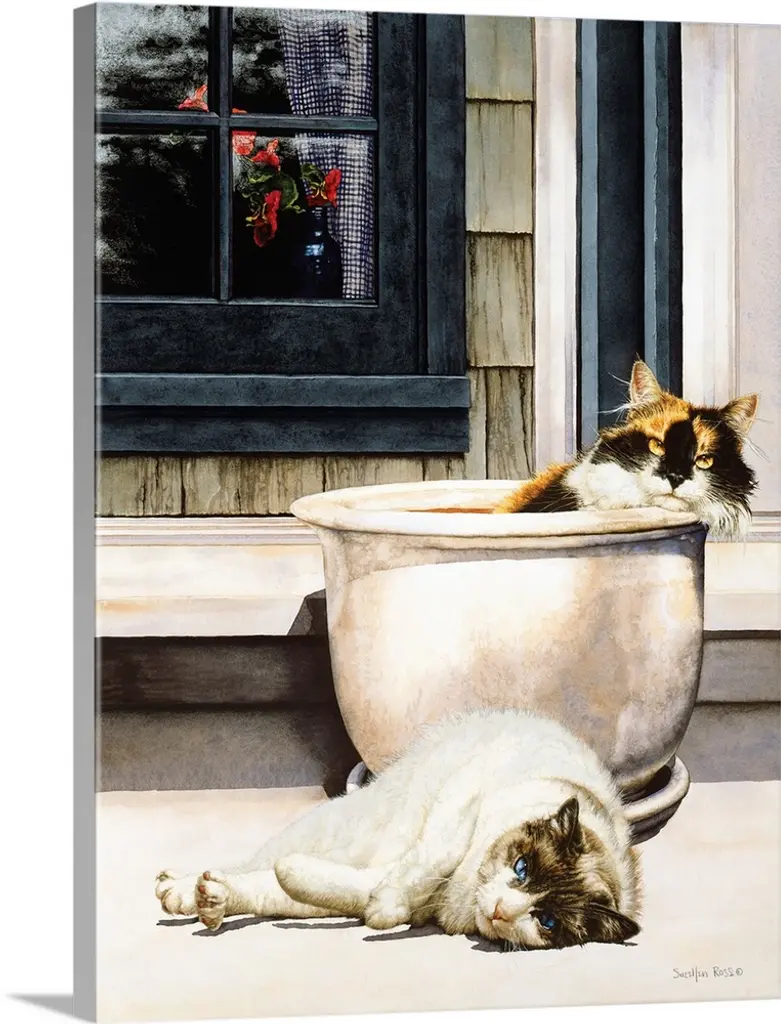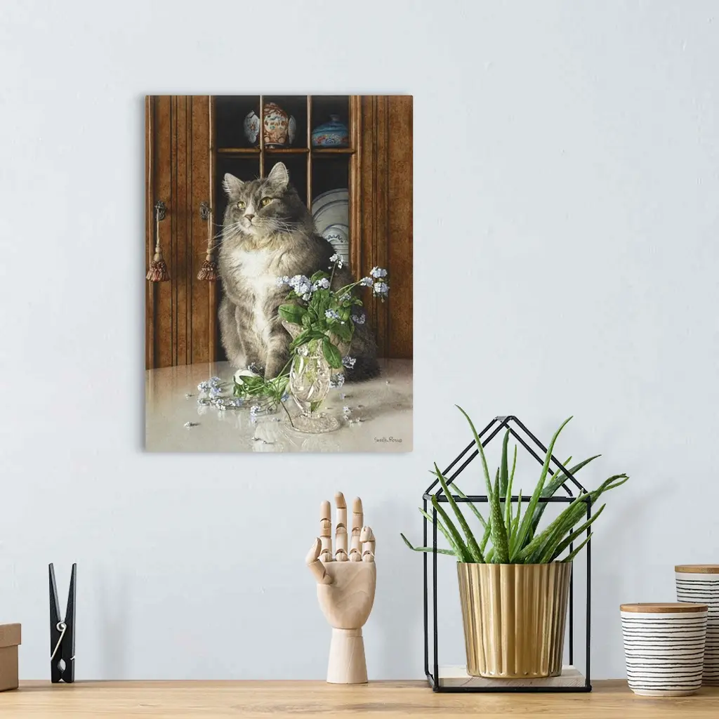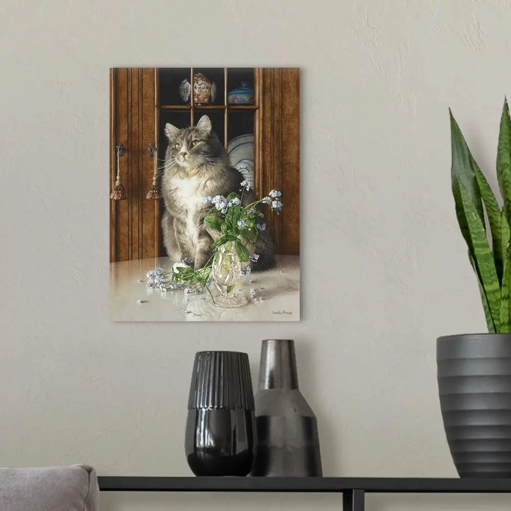 Vertical image of a white and gray cat sitting on a table next to a glass vase of blue flowers.