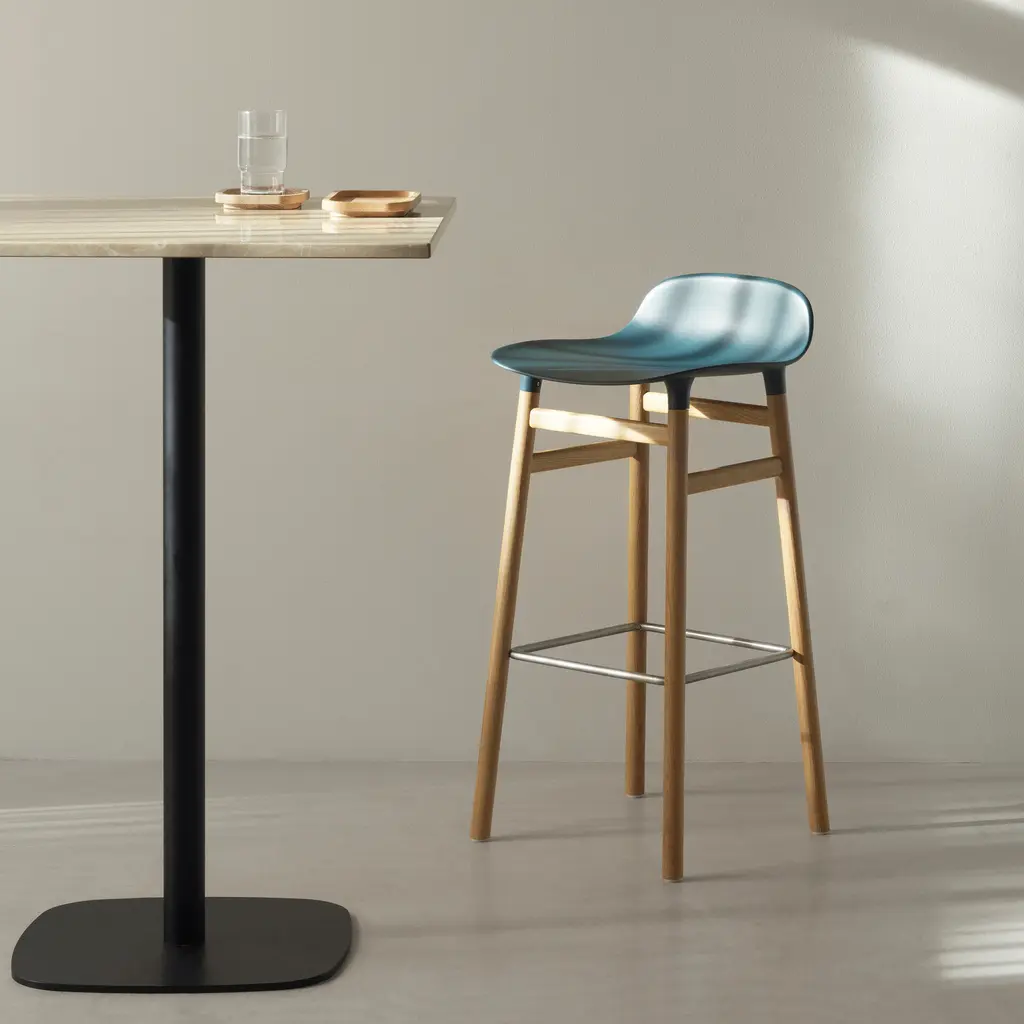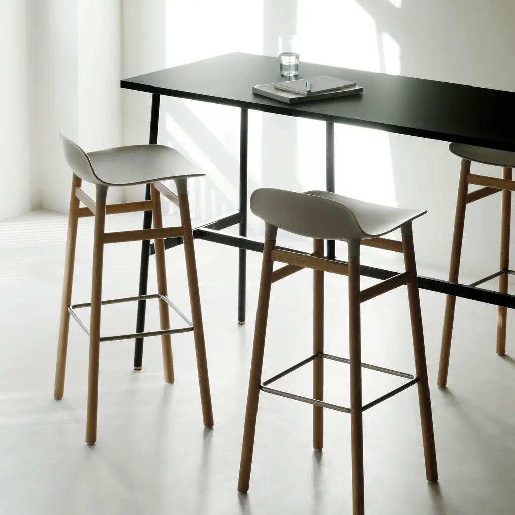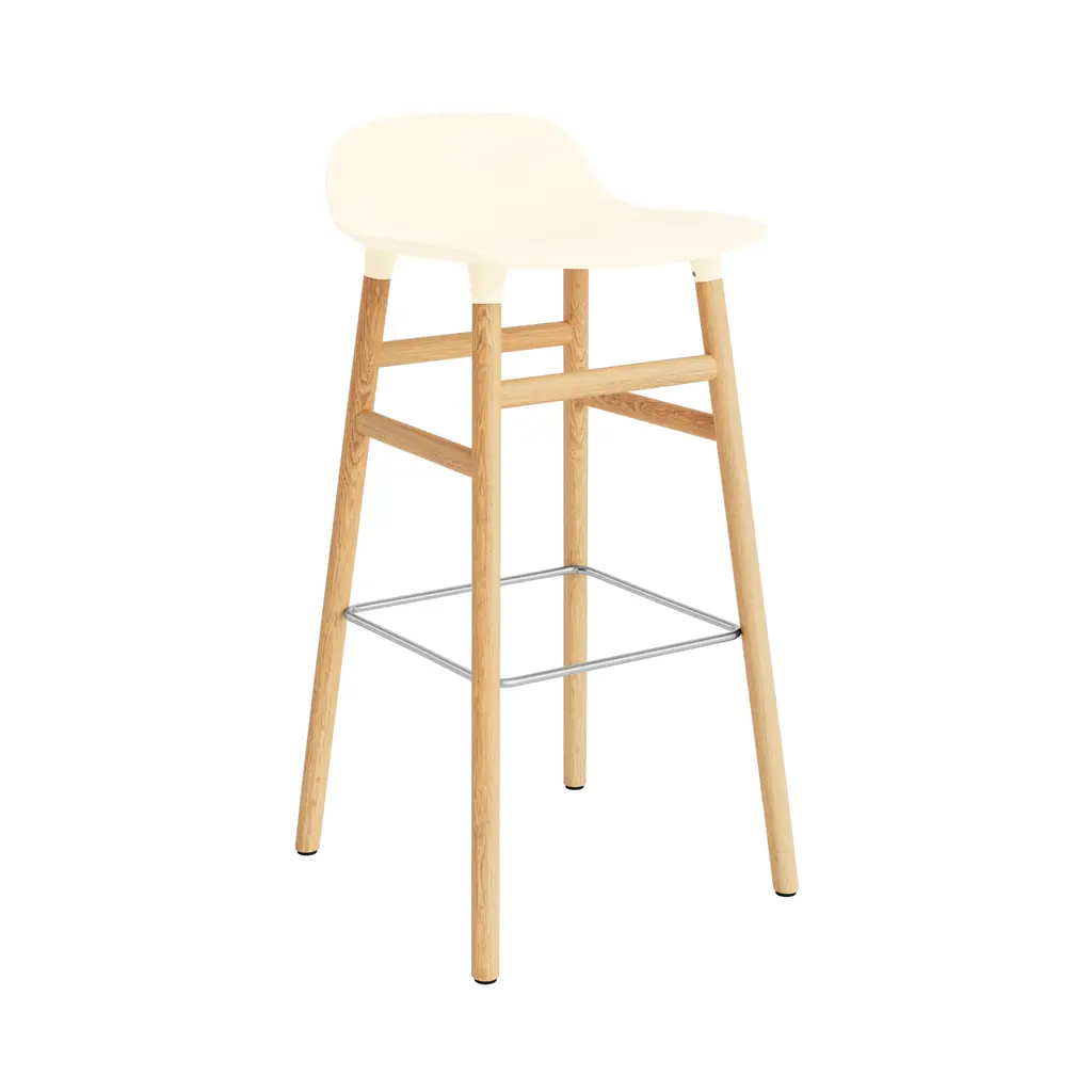 True to Form. All the variations of Danish designer's Simon Legald's Form Collection for Normann Copenhagen hew to his original vision. Here, his seamless polypropylene shell chair morphs into a low-backed stool offered in either counter and bar heights. More than 20 prototypes were sampled over 3 years until arriving at the final variation of molded plastic seat and frameÑshow here in oak.