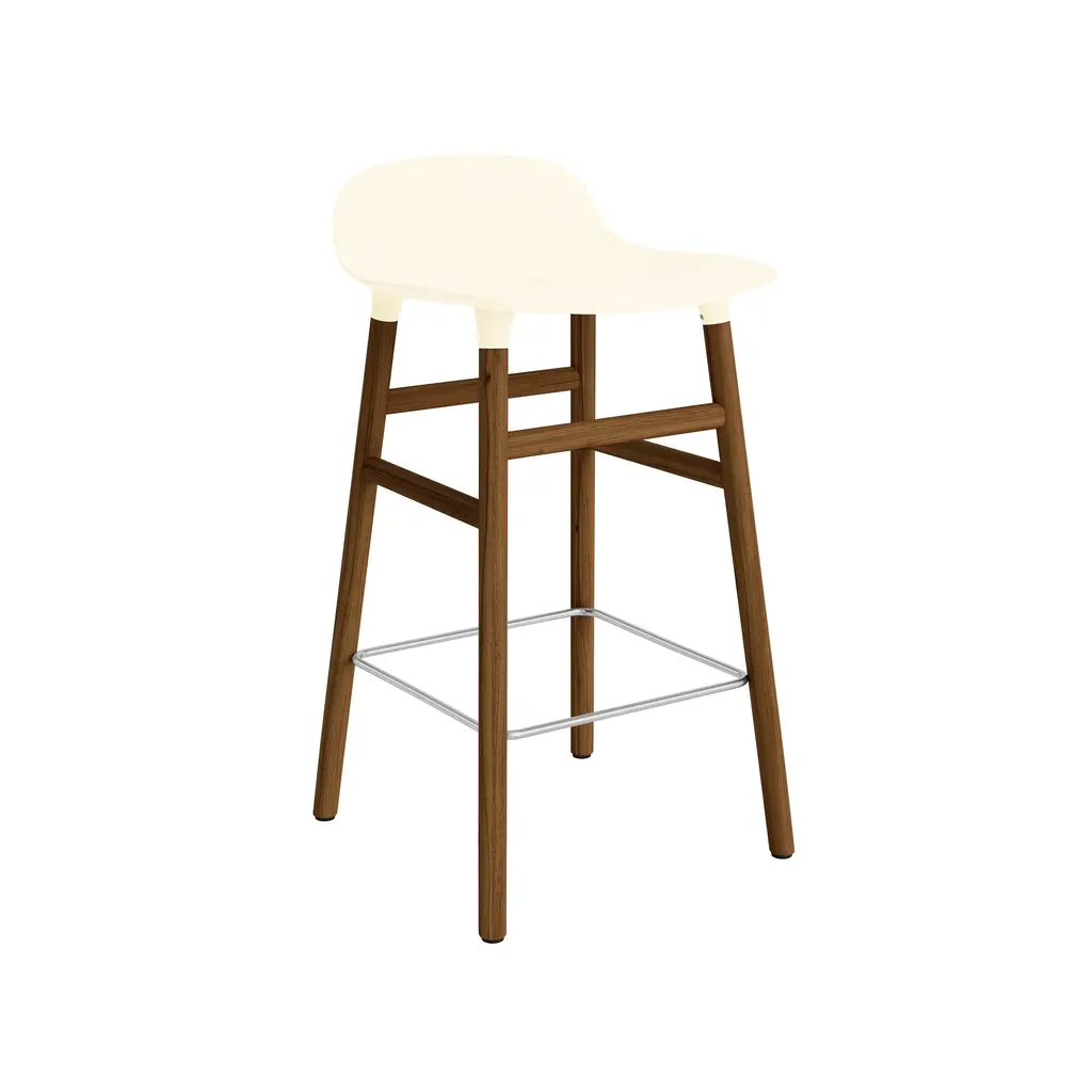 True to Form. All the variations of Danish designer's Simon Legald's Form Collection for Normann Copenhagen hew to his original vision. Here, his seamless polypropylene shell chair morphs into a low-backed stool offered in either counter and bar heights. More than 20 prototypes were sampled over 3 years until arriving at the final variation of molded plastic seat and frame—show here in walnut.