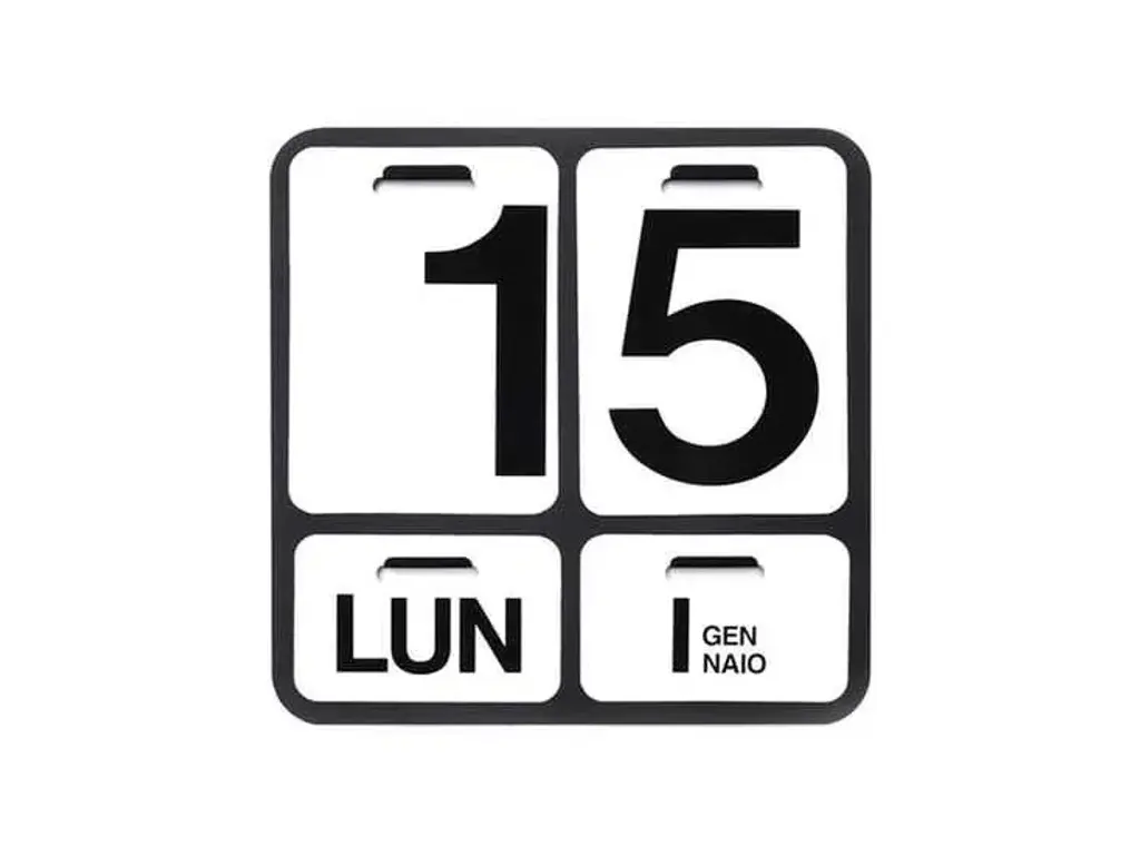 Designer Enzo Mari conceived this reusable calendar in anodized aluminum in response to the rapidly spreading consumerism during the '60s. Minimally accented protrusions are meant to hang the PVC panels displaying litographed letterings respectively indicating numbers, days of the week, and months. The rigorous and minimalist character distinguishing this design is confirmed by the choice of the Helvetica as a clean and effective font. Produced in Italian, please contact the Concierge for other languages.