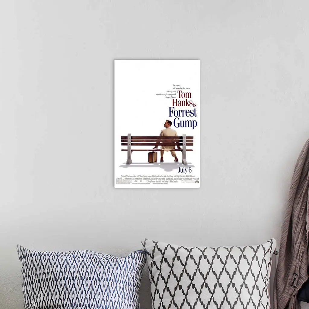 Big, vertical movie advertisement for the opening of Forrest Gump, text and credits on the top and bottom. Tom Hanks as Forrest Gump sits on a wooden bench facing away, looking to his left, his suitcase sits on the ground below him.