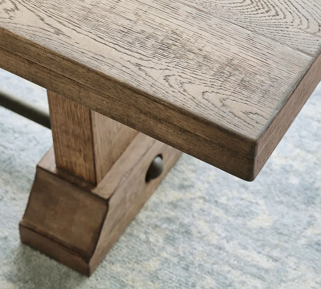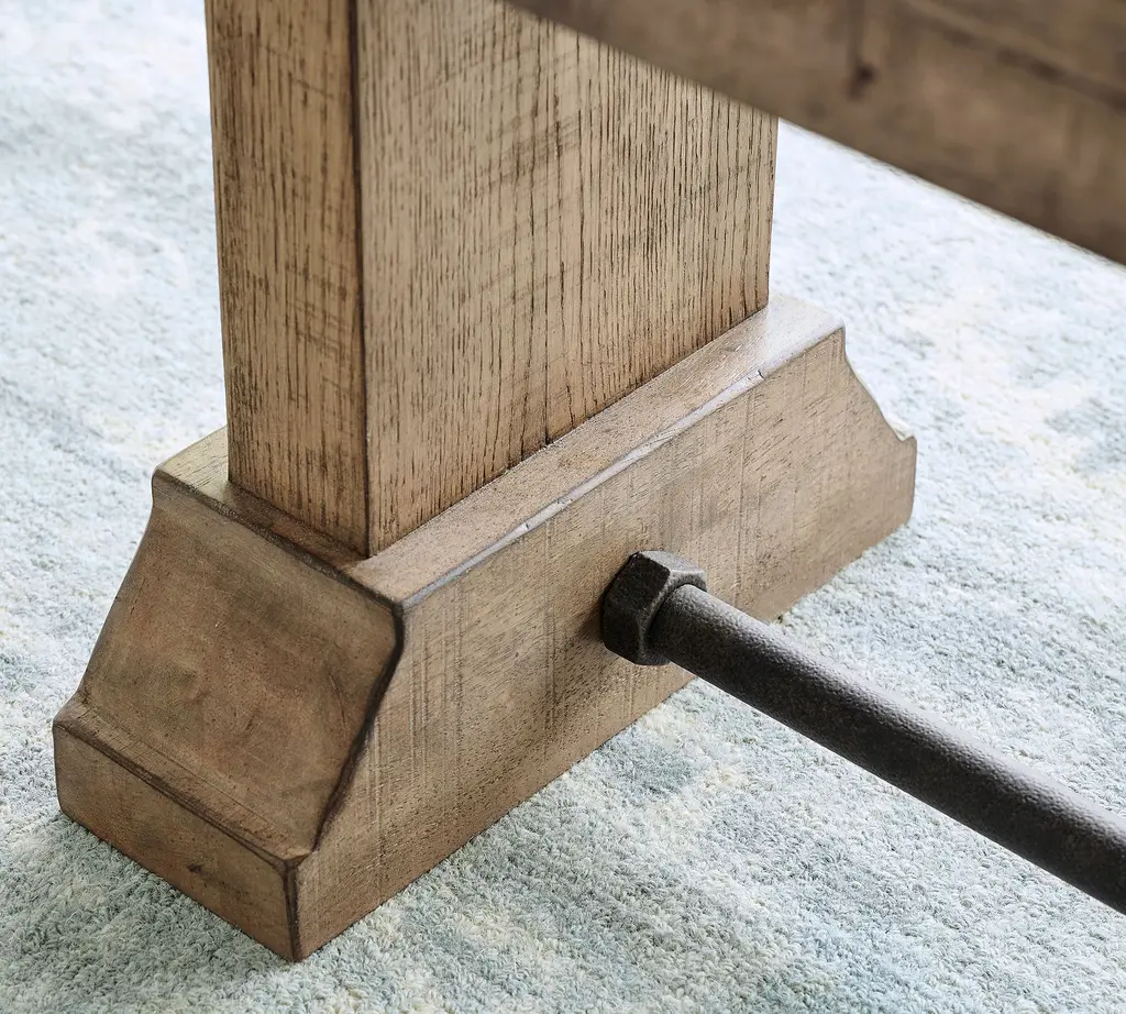 This piece is every bit as practical as the European refectory tables that inspired it. Crafted of wood with oak veneers, the rich finish, beveled trim, and dark metal details give it timeless appeal. Featuring trestle legs and a metal stretcher supporting its spacious seat, this design is versatile enough for an entryway, end of bed, or tableside service.