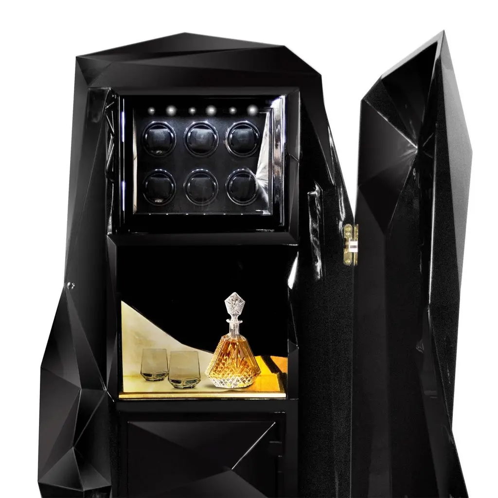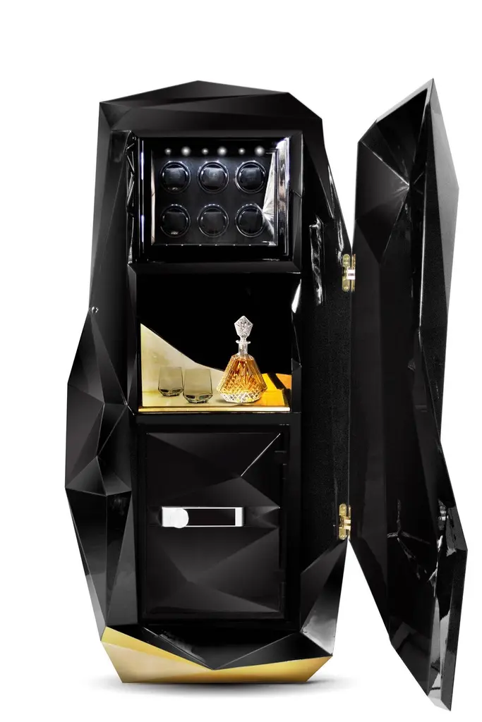 Safe Fortnox with structure in black lacquered solid wood with high gloss varnish finish. All handcrafted, safe inside is composedof three parts, watch winder box on top, middle with gold leaf shelfand a certified safe box at the bottom. With strong base painted ingold leaf. Exceptional piece.