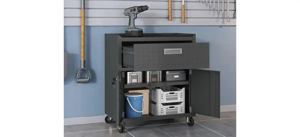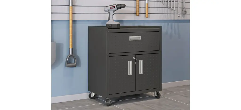 The Fortress Garage Cabinet w/ Drawer is perfect for storing tools, screw kits, and garage accessories. Durable and built to last, this piece is a highly functional unit that belongs in any garage.