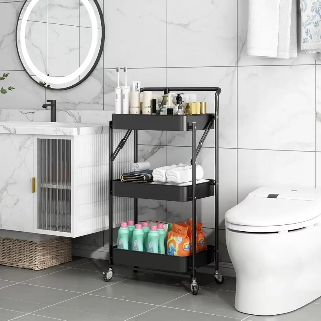 Effortlessly collapse this versatile cart into sliver-thin invisibility for cramped spaces. Three breathable mesh tiers securely cradle contents while promoting airflow and freshness. Confidently haul heavy loads on weather-resistant steel frames, then glide silently across floors with responsive locking wheels. 𝐈𝐧𝐬𝐭𝐚𝐧𝐭 𝐅𝐨𝐥𝐝: The portable lock design folds flat for storage (34.45" L x 11.42" W) with zero wobble, optimizing floor space in tight areas like bathrooms or kitchens. 𝟑-𝐓𝐢𝐞𝐫 𝐁𝐫𝐞𝐚𝐭𝐡𝐚𝐛𝐥𝐞 𝐒𝐭𝐨𝐫𝐚𝐠𝐞: 17"L x 11"W mesh baskets (12.2"H per tier, 2.56" depth) prevent item falls, accelerate drainage, and resist odors for easy cleaning. 𝐑𝐮𝐬𝐭-𝐏𝐫𝐨𝐨𝐟: Anti-scratch, oil-resistant painted steel holds 60 lbs/shelf, ideal for indoor/outdoor use with scratch-free durability. 𝐒𝐦𝐨𝐨𝐭𝐡 𝐌𝐨𝐛𝐢𝐥𝐢𝐭𝐲: 2 lockable 360° wheels + mute rubber casters glide quietly across floors, while a flexible handle ensures effortless steering. 𝐌𝐮𝐥𝐭𝐢 𝐒𝐜𝐞𝐧𝐞 𝐔𝐭𝐢𝐥𝐢𝐭𝐲: Compact 3-tier cart adapts as kitchen storage, bathroom organizer, picnic trolley, or tool rack for clutter free spaces.