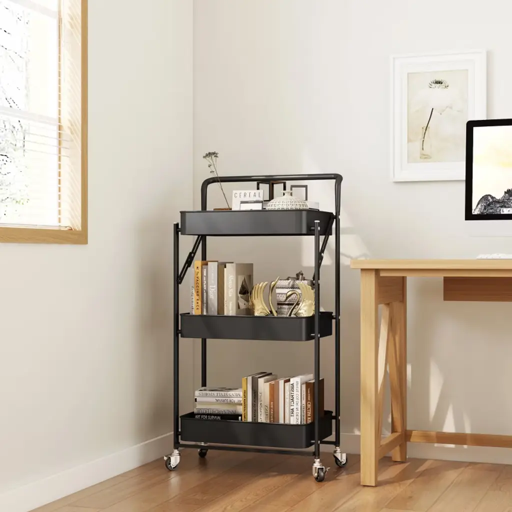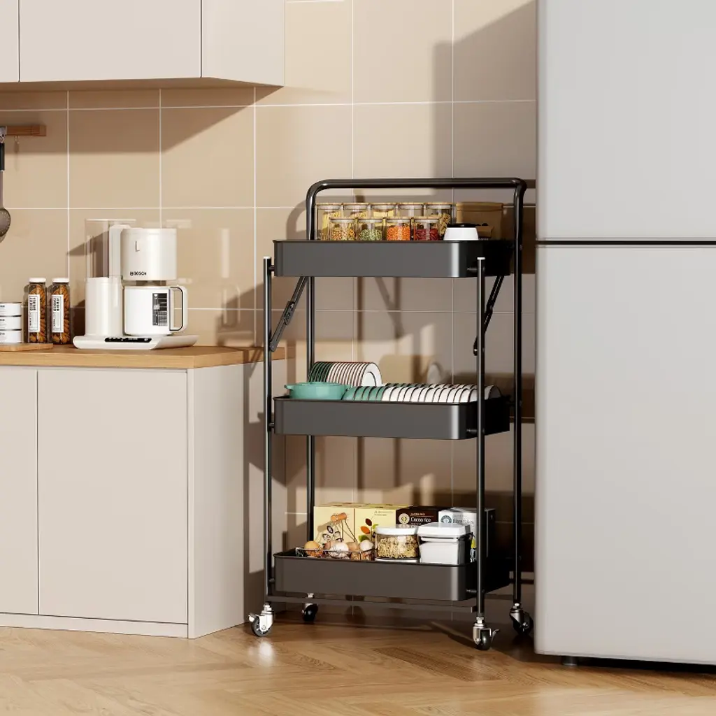 Fortune Candy Foldable 3-tier Rolling Utility Cart, No-assembly Multipurpose Storage Organizer With Handle For Home Or Office, Black