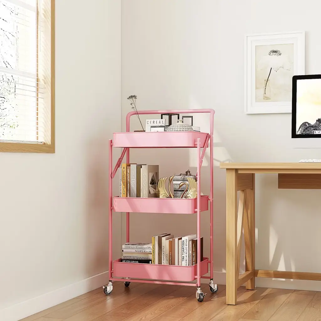 Fortune Candy Foldable 3-tier Rolling Utility Cart, No-assembly Multipurpose Storage Organizer With Handle For Home Or Office, Pink